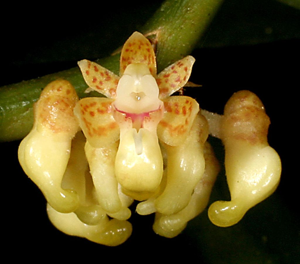 Found in Sabah and Kalamantan Borneo on small branches of understory trees in floodplain of riverine forests at elevations around 300 to 400 to 400 meters as a small to medium sized, hot growing epiphyte with short, slender, somewhat sinuous stems carrying 2 rows of horizontal, linear, tapering to an acute bilobed apex, green, often suffused with maroon leaves that blooms in the spring summer and fall on a short, descending, subsessile, often globular to subglobular, fine white haired, .08" [2 cm] long, crowded, to 25 flowered inflorescence.