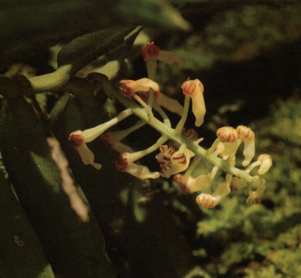 Found in Xizang Zizhiqu province of China in riverside forests at elevations around 800 meters as a miniature to small sized, warm growing epiphyte with an erect stem enveloped by leaf sheath bases carrying 2 ranked, obliquely lanceolate leaves that blooms in the summer on an axillary, shorter than the leaf, to 7" [17.5 cm] long, 10 to 15 flowered inflorescence.