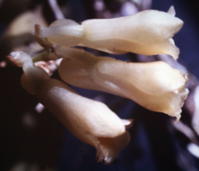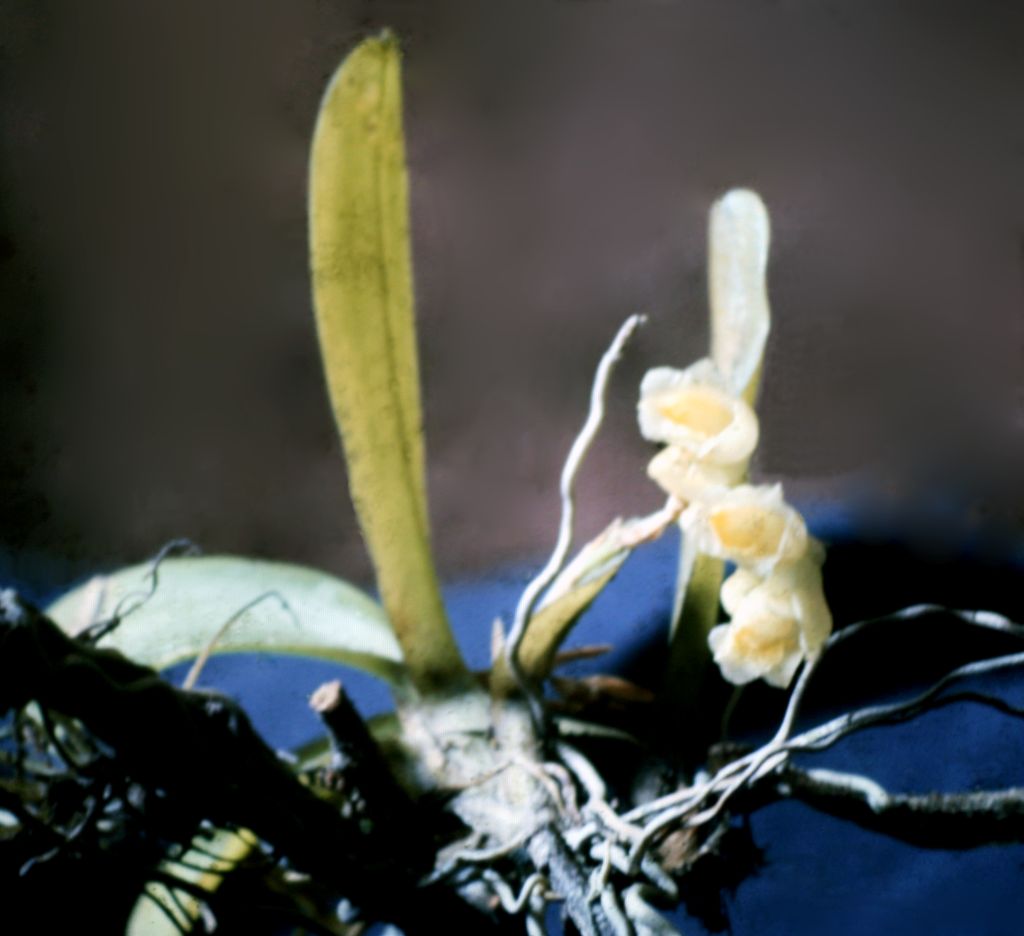 Found in Venezuela, Guyana and Surinam along creeks as a miniature to small sized, hot to warm growing epiphyte with a creeping rhizome, and 1.2" [3 cm] between each pseudobulb carrying a single clear green, asymetrical apex leaf that blooms in the summer on a basal, arching, short, green, racemose, few flowered inflorescence