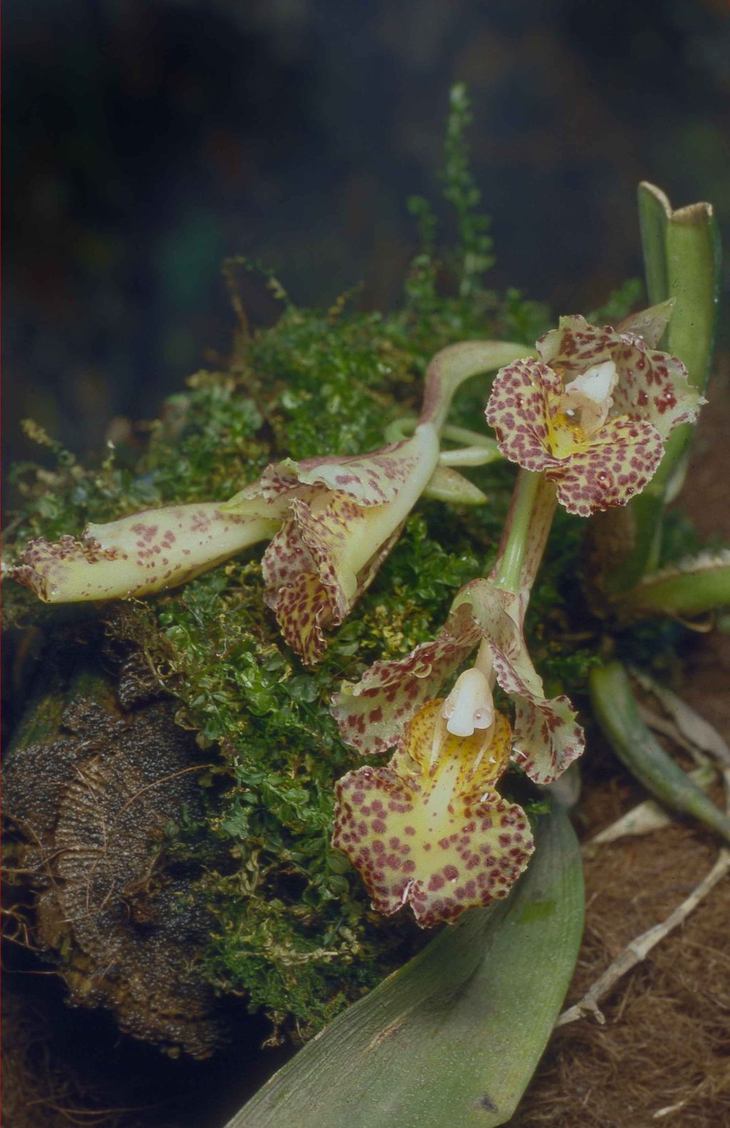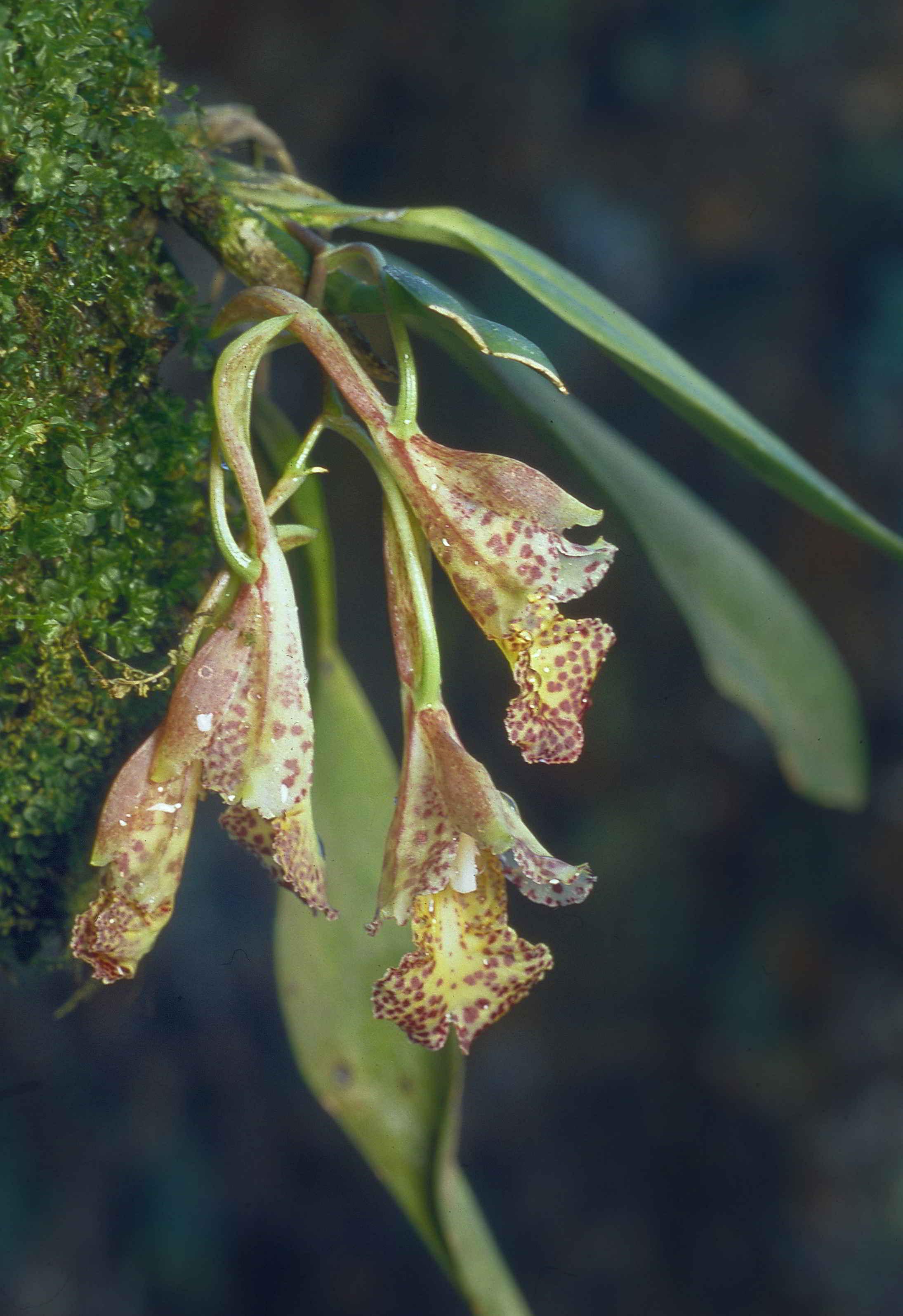 Found in Bolivia in wet montane forests at elevations around 1200 meters as a mini-miniature sized, warm growing epiphyte with clustered, lightly compressed, smooth, narrowly fusiform pseuedobulbs carrying a single, apical, erect, elliptical, subcoriaceous, conduplicate towards the base leaf that blooms in the summer on a basal, racemose, [3.2" [87 cm] long, few flowered inflorescence.
