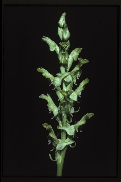 Found in Ethiopia, Kenya, Tanzania, Malawi and Zambia in swamps and damp grasslands at elevations of 2000 to 2500 meters as a large sized, cold growing terrestrial with ellipsoid tubers giving rise to an erect leafy throughout stem carrying smaller below, the middle largest and grading to bract-like leaves above that blooms fall on an erect, 3.6 to 10.8" [9 to 27 cm] long, densely many flowered inflorescence
