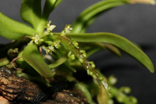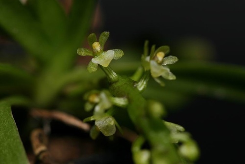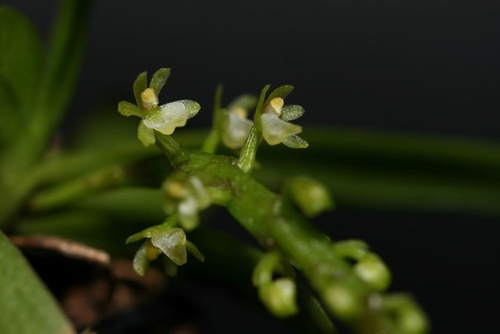 Found in Taiwan on the Hengchun penninsula in broad leaved forests at elevations of 400 to 500 meters as a mini-miniature sized, hot growing epiphyte with an abbreviated stem carrying 3 to 5, pale green, obliquely lanceolate, leathery, obtusely bilobed apically leaves that blooms on a racemose, arching, peduncle generally shorter than the rachis, rachis thickest in the middle, 13 to 19 flowered inflorescence.