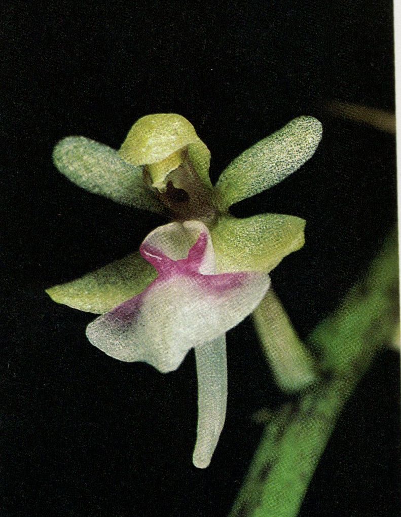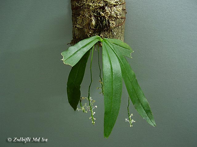 Found in the eastern Himalayas, Bhutan, Sikkim, Myanmar and Thailand in subtropical forests at elevations around 290 to 500 meters as a miniature sized, hot growing epiphyte with flattened roots and a stem enveloped by leaf bearing sheaths carrying 3, narrowly oblong-elliptic to narrowly obovate, curved, prominently veined beneath, unequally bifid apically, lobes oblong-triangular, sessile, jointed leaves that blooms in the spring on a pendant 6" [15 cm] long, several flowered inflorescence with the successively opening, membraneous flowers congregated towards the apex