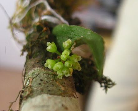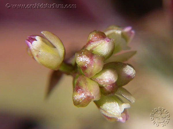 Found in Bolivia, southeastern Brazil and northwestern Argentina in swamplands often in light moss as a mini-miniature sized, warm growing epiphyte with 3 to 6, clustered, erect, oblong-ovate, truncate apically, lustrous, wrinkled, dark green speckled with purple pseudobulbs carrying oblong-elliptic, acute, subcoriaceous, recurved to subpendent, dark green above, clear green with purplish suffused leaves that blooms in the fall on a racemose, basal, arcuate, to 3.8" [to 9 cm] long, 5 to 18 flowered inflorescence holding all the flowers in the apical third .