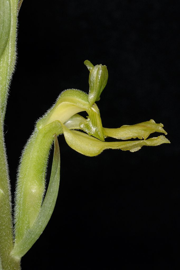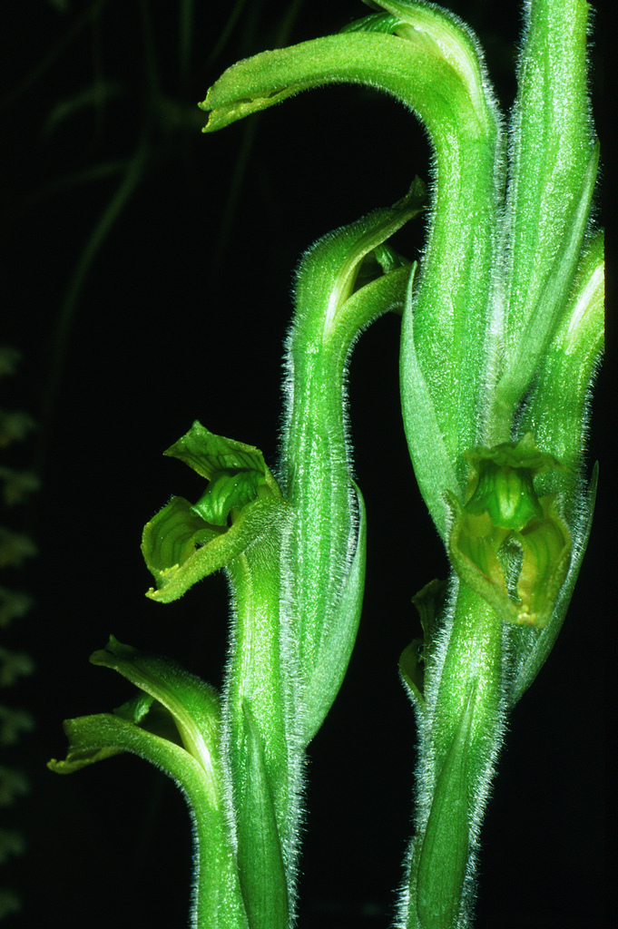 Found in Rio de Janiero state of Brazil at elevations around 300 meters as a large sized, hot to warm growing terrestrial with an abbreviated stem carrying rosulate, elliptic-oblanceolate, petiolate acute, dark green with longitudinal silvery striped leaves that blooms in the spring on a stiffly erect, long-pedunculate, racmose, 26" [65 cm] long, pubescent, densely many [7 to 35] flowered infloreescence with lancolate, acuminate, as long as the ovaries to more floral bracts