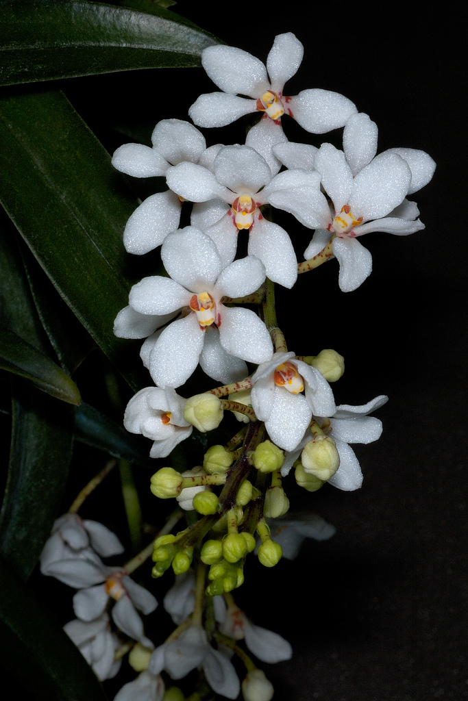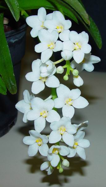 An eastern Australian, small to medium sized, cool to hot growing, lithophytic and sometimes epiphytic species found on exposed cliffs at altitudes up to 1000 meters, near to the sea and is vandanaceous in form, with numerous, stout, erect stems carrying 6 to 8, thick, fleshy, oblong-lanceolate, falcate, obliquely emarginate or acute leaves that blooms on a erect to arcuate, reddish, axillary, 3 to 10" [6 to 25 cm] long, several to many [up to 25] flowered inflorescence that is longer than the leaves, occuring in the spring and has non-fragrant flowers. They can be mounted or grown in a pot with regular water and fertilizer while in growth and as they mature a lessening is desireable.