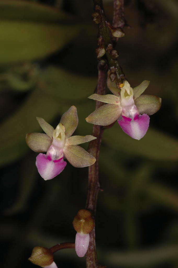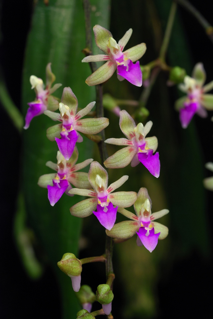 A miniature, monopodial hot to warm growing epiphyte occuring only in Java in primary forests at elevations around 1000 meters with short, descending yet apically upwards turned stems with flat, tough, leathery, dark green, apically unequally bilobed leaves that blooms on an axillary, arching to pendant, 18" [45 cm] long, paniculate, densely many flowered inflorescence occuring in the fall.