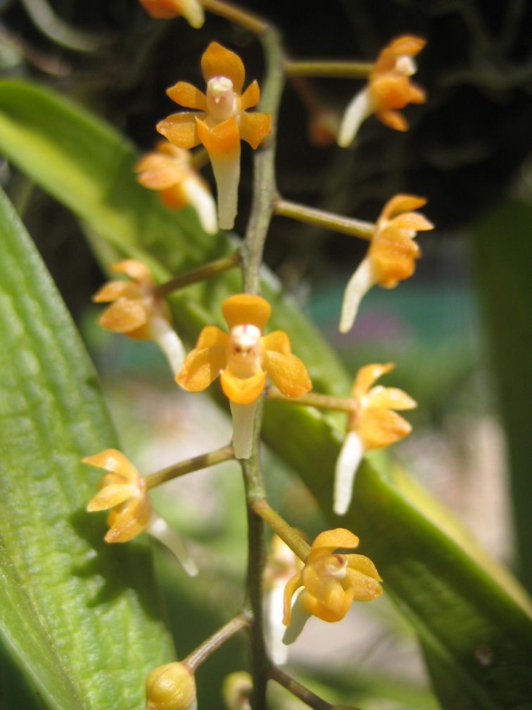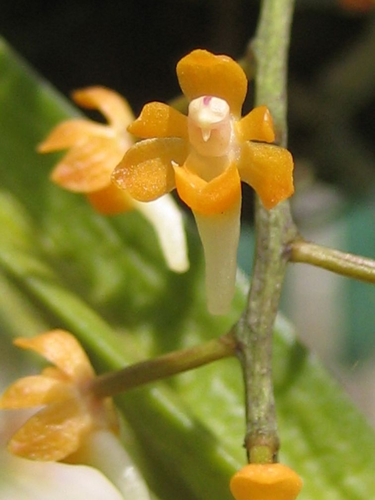 Found in Myanmar and Thailand as a miniature sized epiphyte with an erect stem cenveloped by leaf bearing sheaths carrying lorate, bifid apically leaves that blooms on a descending, thin, 5" [12.5 cm] long, laxly several flowered inflorescence