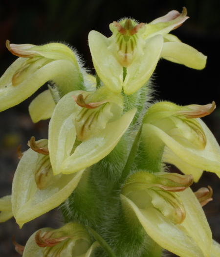 Found in Colombia, Peru, Brazil and Argentina as a medium sized, warm to cool growing almost leafless at blooming terrestrial orchid with an erect, thick stem almost completely enveloped by the inferior , retusiusiculate bracts and the superior, with almost lanceolate, recurved, unequally retusiusculate apice bracts that blooms in the late summer and early fall on an erect to 8 to 10" [20 to 25 cm] long, densely many flowered cylindric inflorescence with non resupinate flowers and densely pilose ovaries, pedicels and the underside of the lip.