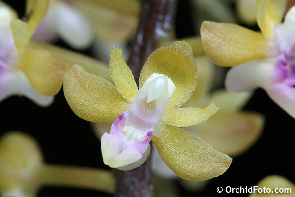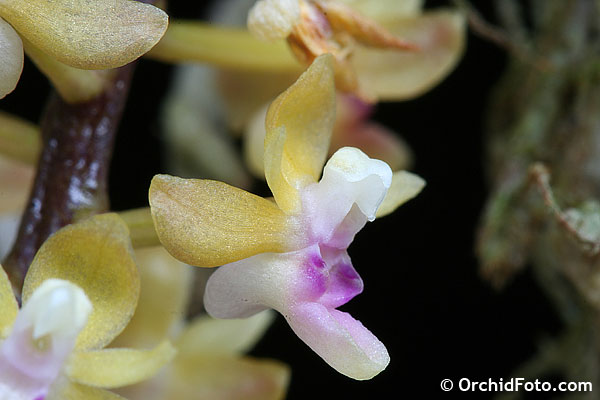Found in northern Thailand at elevations around 1600 meters as a mini-miniature sized, cool growing epiphyte with a short, stout stem carrying strap-shaped, deeply unequally bilobed apically leaves that blooms in the late winter and early spring on a pendent, 1 to 3" [2.5 to 7.5 cm] long, many flowered inflorescence