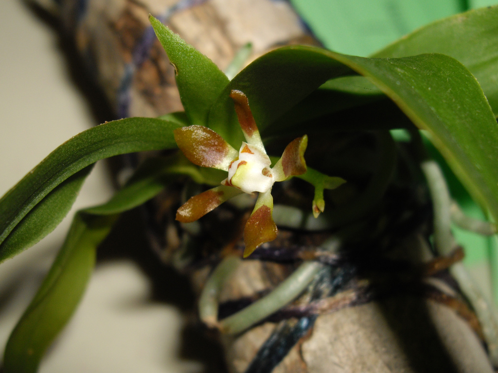 Found in northern Queensland Australia in dense highland forests on slopes above streams and on shrubs and small trees at streamsides at elevations of 900 to 1600 meters as a miniature to small sized, warm to cool growing epiphtye with a pendulous stem carrying 3 to 6, crowded, curved, mid to dark green, wavy margined, finely toothed leaves that blooms in the mid winter through early summer on an axillary, club-shaped, fleshy, .8 to 1.6" [2 to 4 cm] long, 2 to 10 flowered inflorescence
