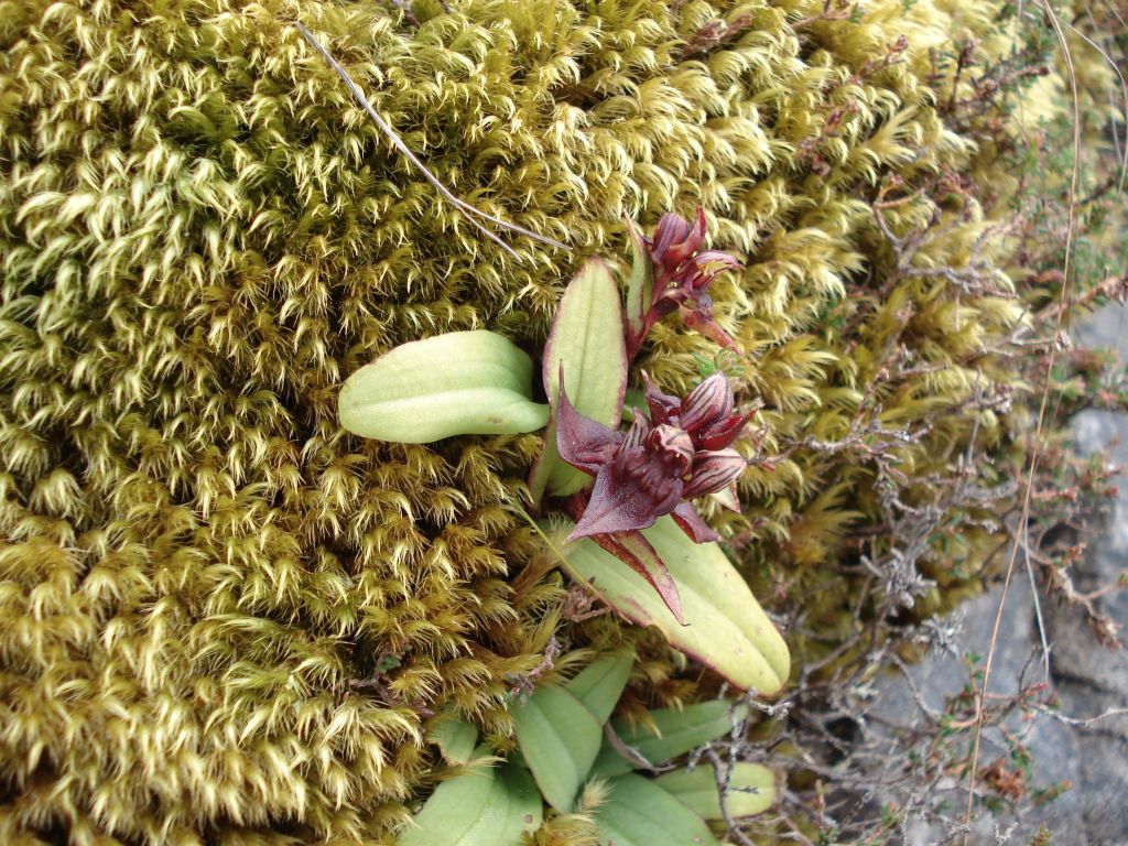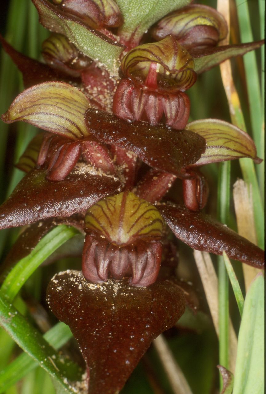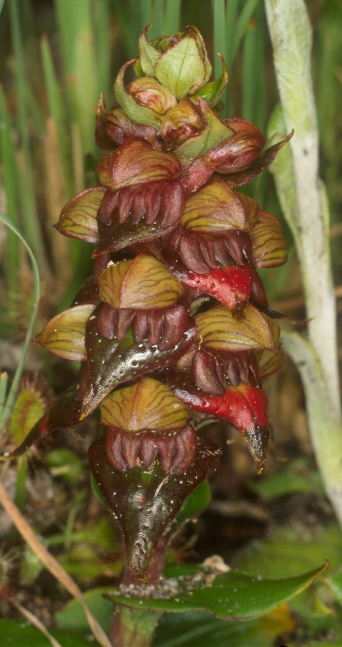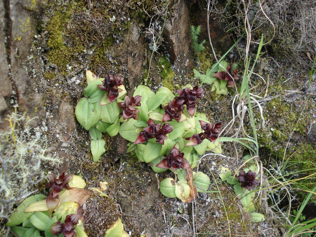 Found in Lesotho, and Cape Province, Natal and Transvaal South Africa in dry flats and wet marshy areas, peaty ledges and fissures amongst rocks at elevations of sea level to 2000 meters as a slender to stout, mini-miniature sized, cool to cold growing terrestrial orchid with 2, low to the ground, broadly lanceolate, acute basally clasping leaves and another 5 more erect ones above at intervals along the stem that blooms in the spring on an erect, 4" [10 cm] long, few flowered inflorescence with ovate, green with red, acute, recurved flroal bracts and carrying smaller, non-resupinate, scented [rotten meat] flowers.