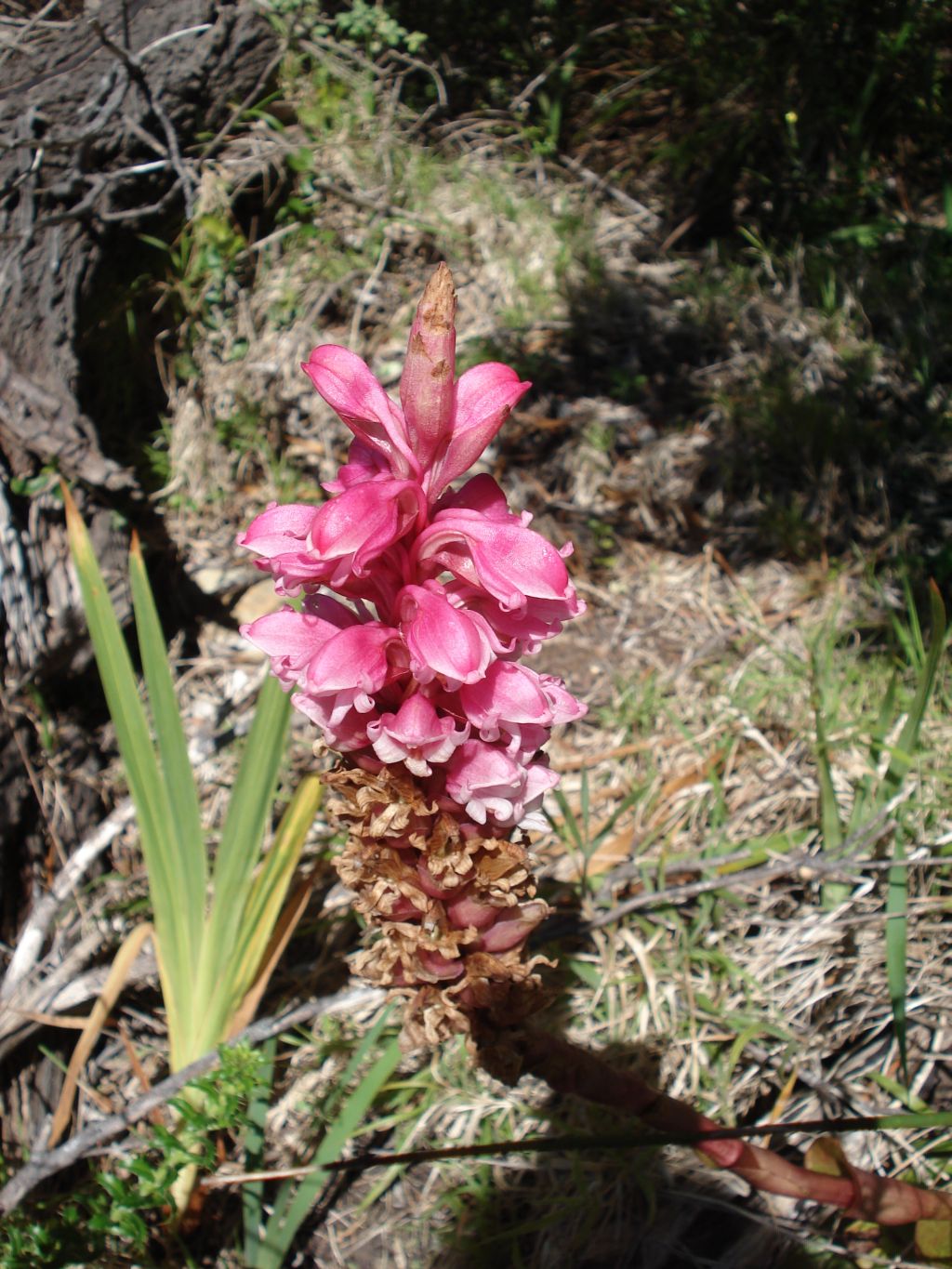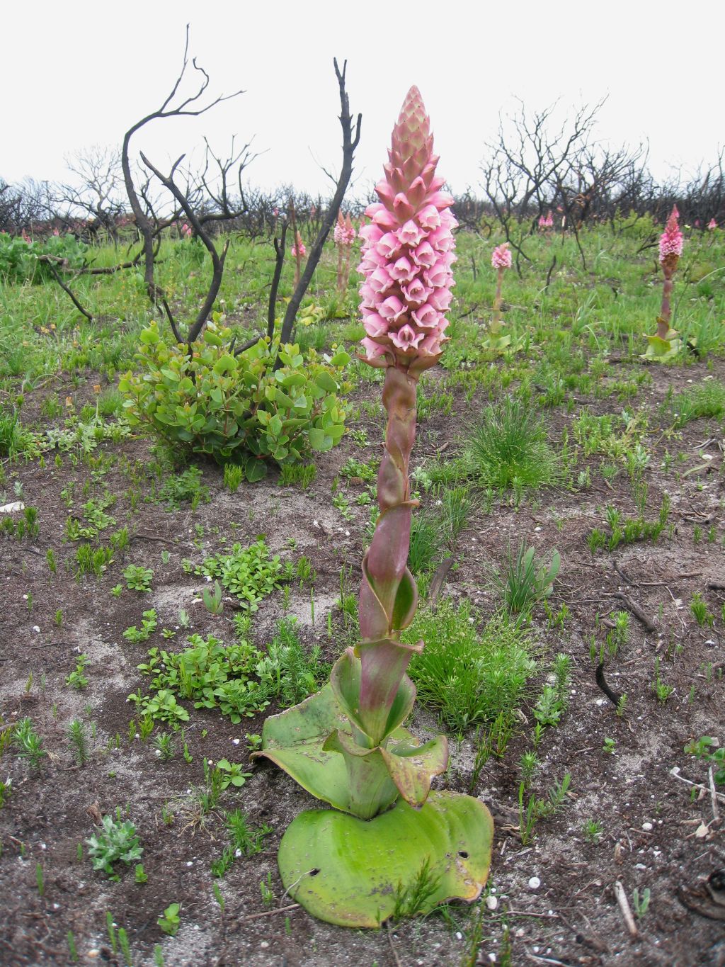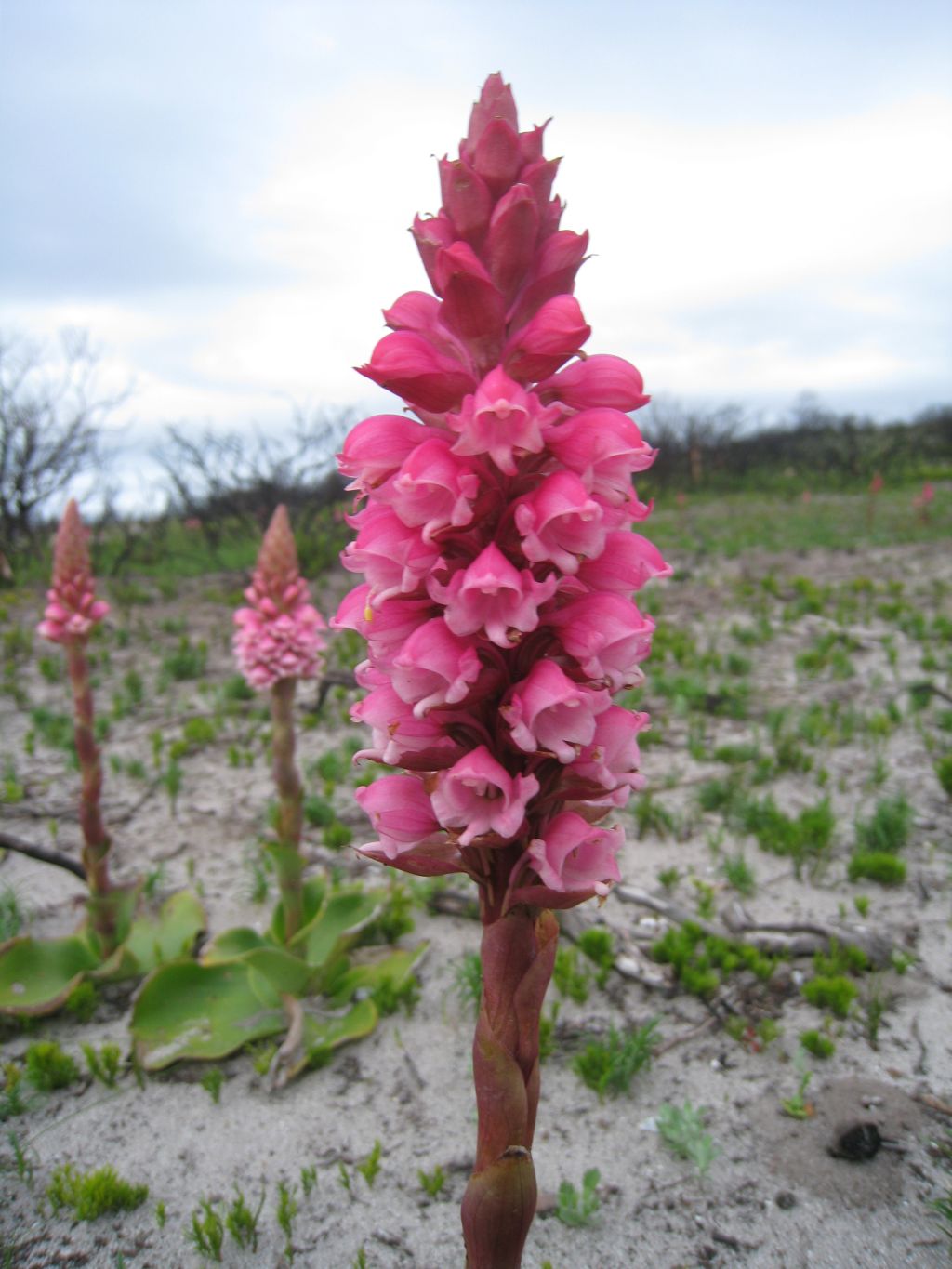 Found in eastern to southeastern South Africa among sand dune brush, in fynbos on coastal hills and on ridges on moist to dry sands and limestones as a medium to large sized, cold growing terrestrtial arising from bifid tubers giving rise to 2 to 4, thick, fleshy, lowest 2 adpressed to the ground, gradual transition above to the sheaths above leaves that blooms in the spring on a stout, dense, 10" [25 cm] long, 19 to 38 flowered inflorescnece with partly deflexed, minutely ciliate bracts that are almost 2 times as long as the ovary and carries fragrant flowers