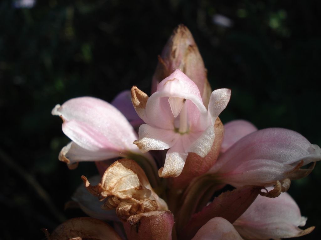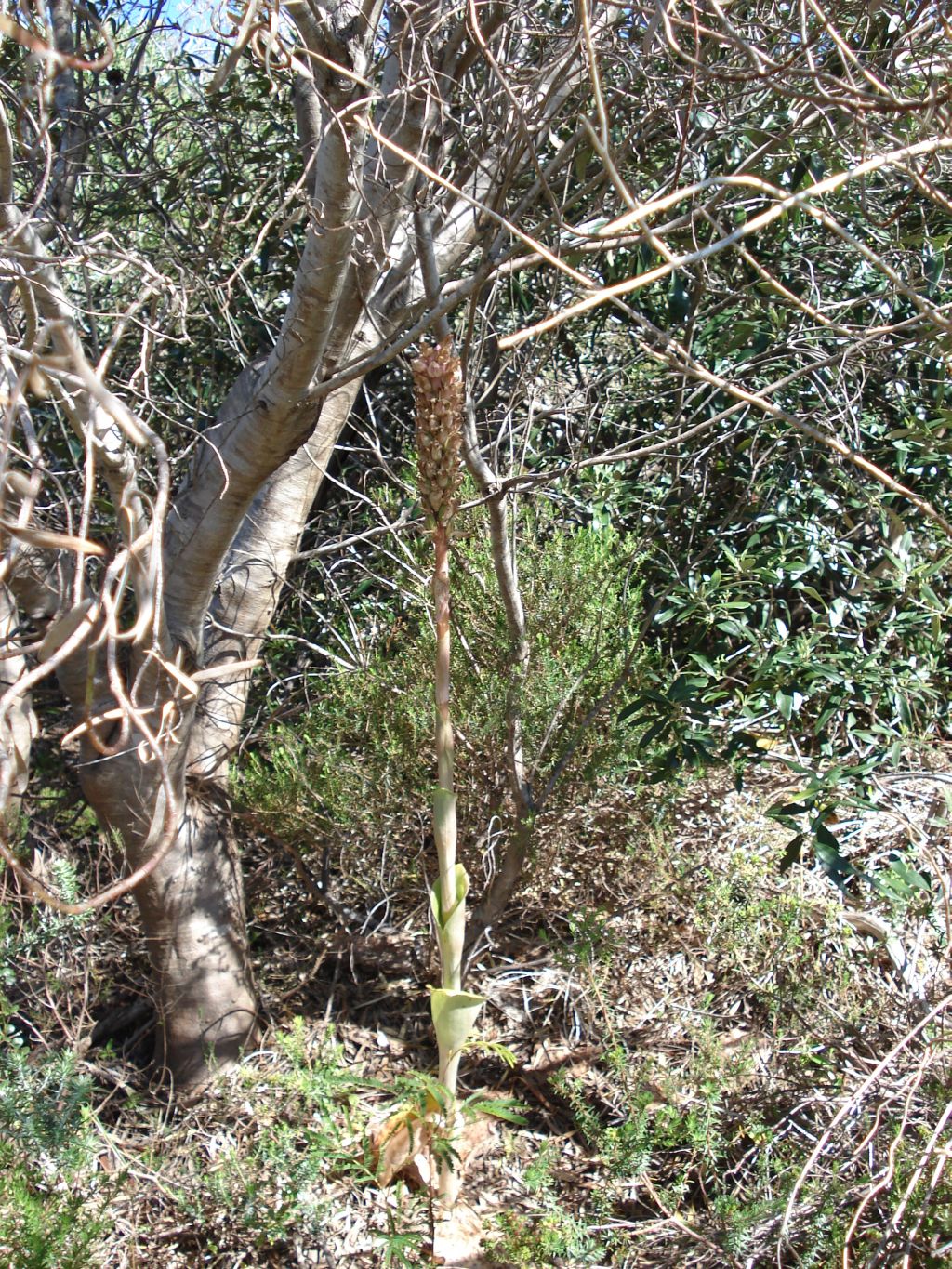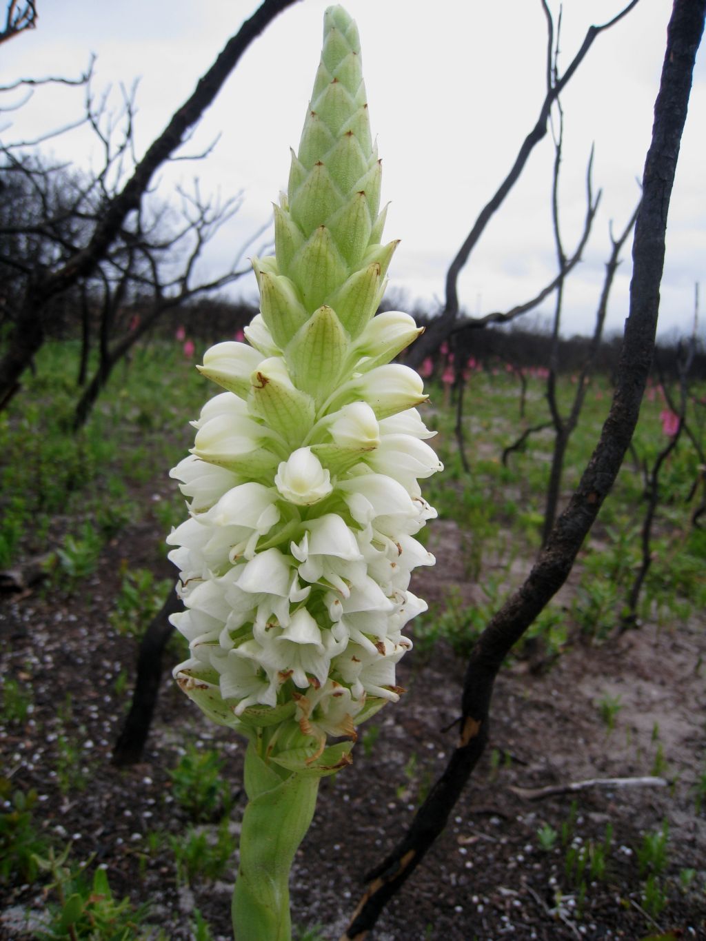 Found in eastern to southeastern South Africa among sand dune brush, in fynbos on coastal hills and on ridges on moist to dry sands and limestones as a medium to large sized, cold growing terrestrtial arising from bifid tubers giving rise to 2 to 4, thick, fleshy, lowest 2 adpressed to the ground, gradual transition above to the sheaths above leaves that blooms in the spring on a stout, dense, 10" [25 cm] long, 19 to 38 flowered inflorescnece with partly deflexed, minutely ciliate bracts that are almost 2 times as long as the ovary and carries fragrant flowers