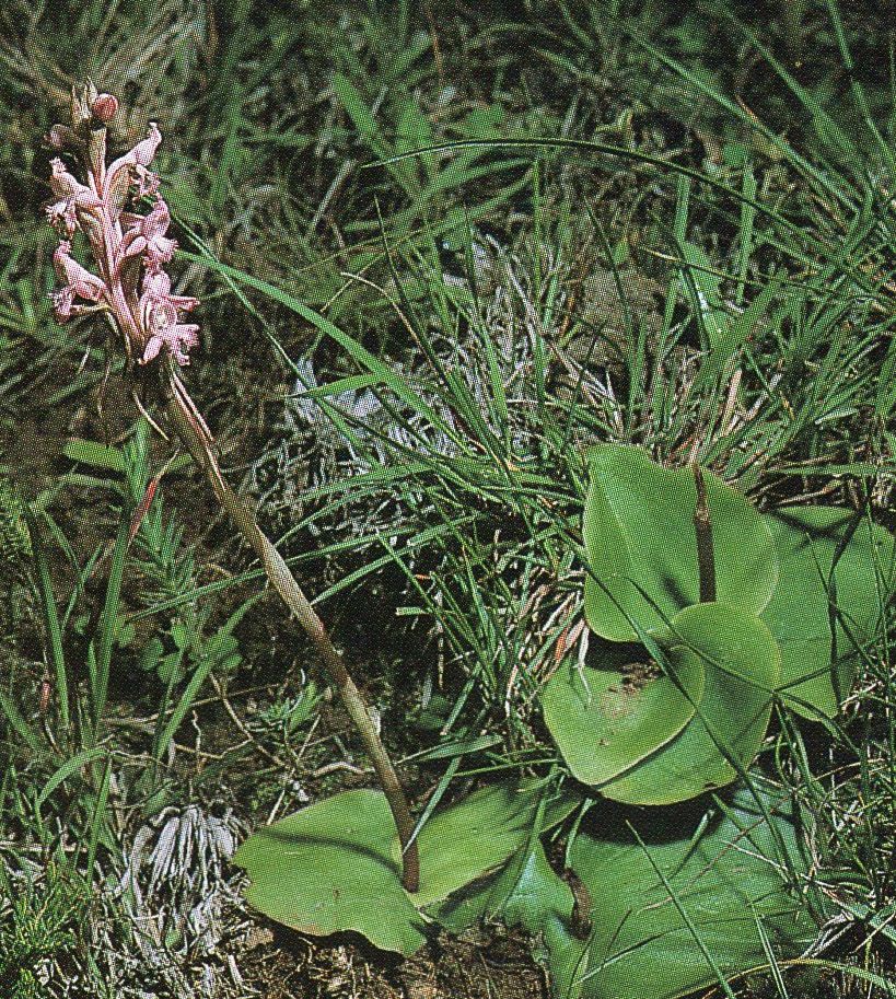 Found in Sudan, Uganda, Kenya and Tanzania in open grasslands near strams and forest margins and also on stony slopes and on rock lerdges at elevations of 2000 to 3300 meters as a small to medium sized, cold growing terrestrial with 1 to 2, ovoid to ellipsoid tubers giving rise to an erect stem with just a few, spaced out along the length sheaths and carrying 2 basal, adpressed to the ground, broadly ovate to reniform leaves that blooms in the later spring through summer on a terminal, erect, 1.6 to 5.2" [ 4 to 13 cm] long, 6 to 12 flowered inflorescence with erect, acute, brownish, similar to the sheaths floral bracts.