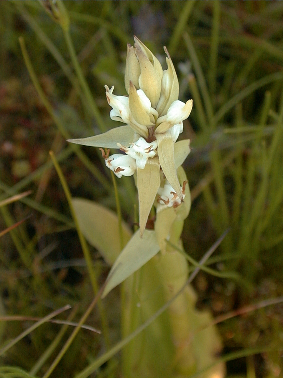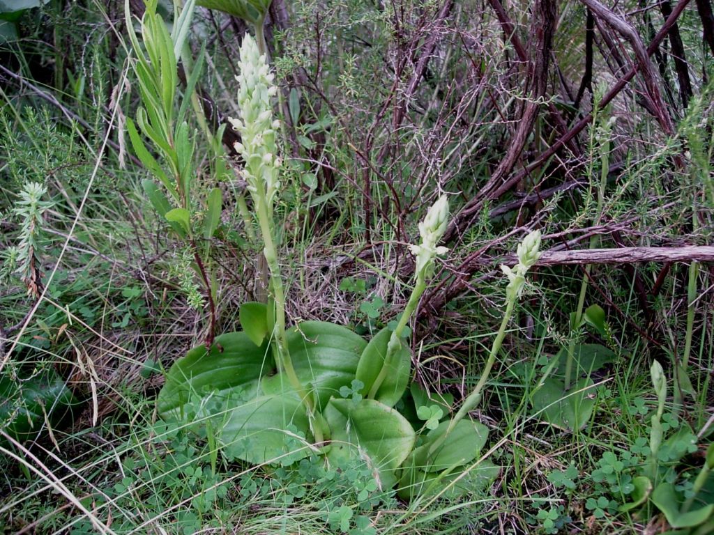 Found in Cape Province, Natal and Orange Free State in coastal scrub, woodlands and moist to marshy flats among grass at elevations of 70 to 2000 meters in full sun as a miniature to medium sized, cold growing terrestrial with 1 to 4, lower ground hugging leaves grading smaller up the stem that blooms in the spring on an erect, terminal, to 5 to 13.2" [2 to 33 cm] long, 4 to 85 flowered inflorescence with deflexed, lanceolate 1.5 to 3 times longer than the ovary floral bracts and carrying highly fragrant flowers