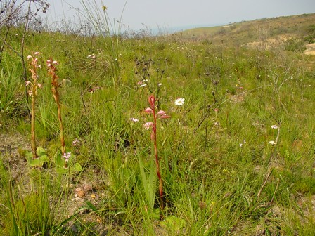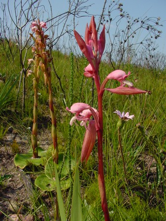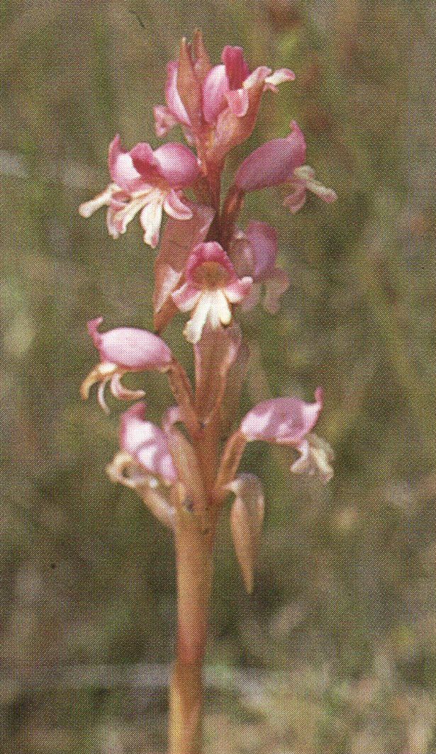 Found in southern Cape Province South Africa in fynbos on relatively dry slopes at elevations of 100 to 380 meters as a small to medium sized, cold growing terrerstrial with 1 to 2, adpressed to the ground, broadly ovate to orbicular leaves and the erect flowering stem is enveloped by 6, reddish below, green above, flask-like, water holding sheaths that blooms in the later winter and early spring on an erect, terminal, [18 to 52 cm] long, moderately dense, 3 to 12 flowered inflorescence carrying mildly fragrant flowers with fully deflexed, 2 to 2.5 times longer than the ovary floral bracts at blooming.