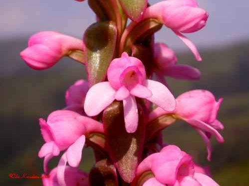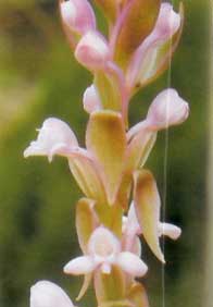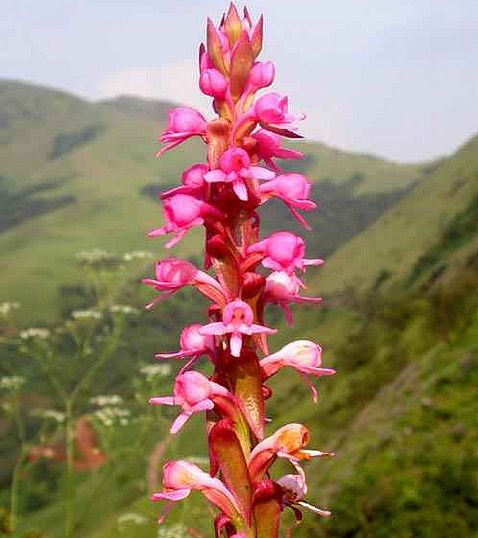 Found in China, western Himalayas, Pakistan, India, Sri Lanka, Eastern Himalayas, Nepal and Bhutan in open grasslands at elevations of 2100 to 3700 meters as a miniature to large sized, cool to cold growing terrestrial with 1 ro 2, ovoid-cylindric tubers giving rise to a sout, bracteate above stem carrying 2 to 3, oblong to ovate-lanceolate, sub-basal, fleshy, basally clasping leaves that blooms in the summer and fall on an erect, 6.8" to 17.6" [17 to 44 cm] long, densely many flowered inflorescence with oblong-lanceolate, leaf-like floral bracts that exceed the ovary in length and carrying fragrant flowers