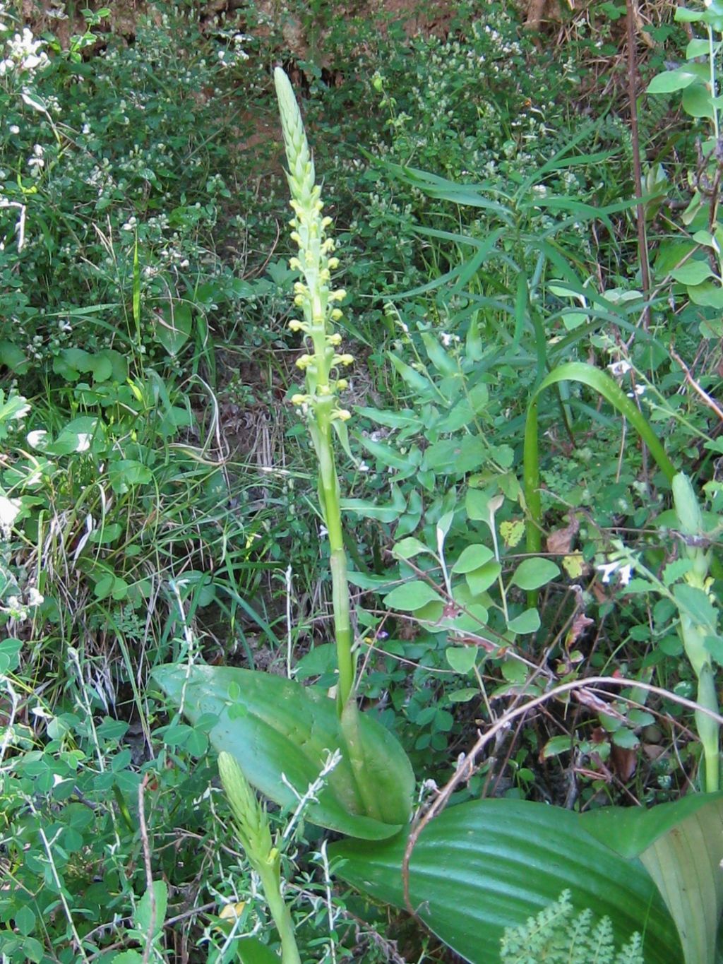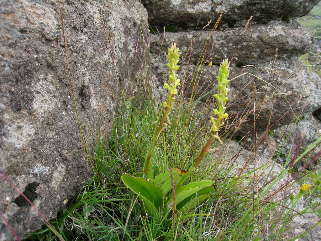 Found in Lesotho, Swaziland and Cape, Natal, Orange free State and Transvaal South Africa in open high altitude grasslands and in shady forests at elevations of 900 to 2200 meters as a medium sized, cool growing terrestrial with 2 to 4, thick, ovate, acute, basal leaves on a separate shoot from the small bract-like leafy flowering stem that blooms in the late spring and summer on an erect, loosely several to many [20 to 100] flowered inflorescence carrying non-resupinate, sweet-spicy scented flowers.