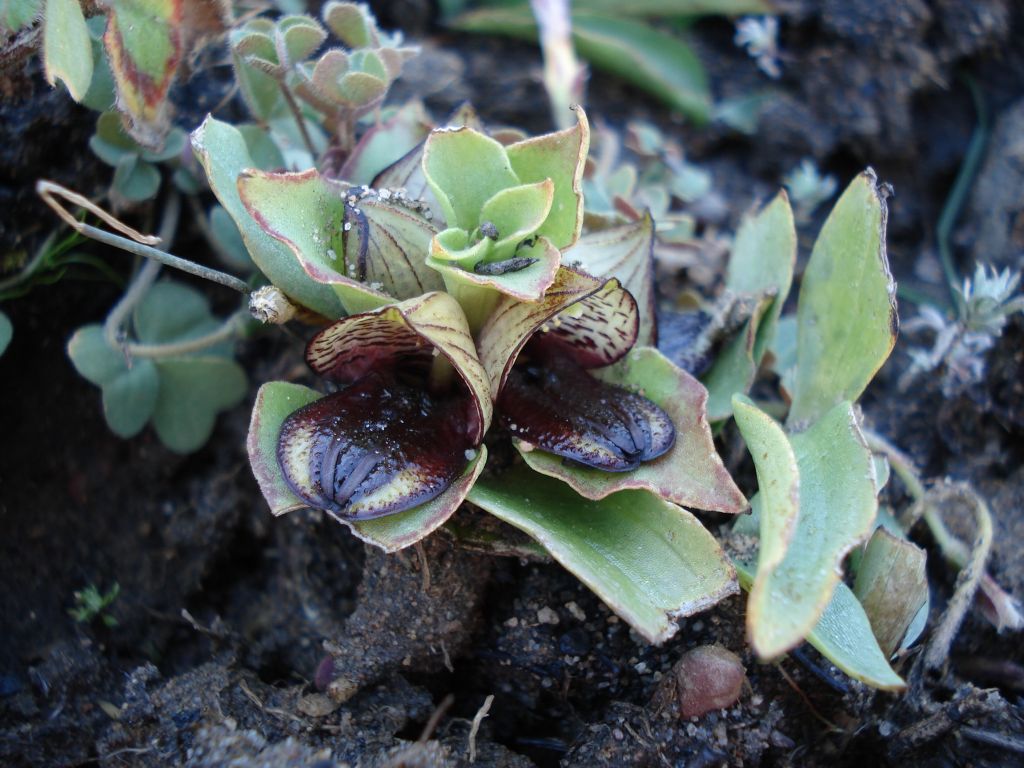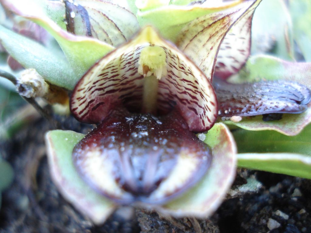 Found in the Cape Province of South Africa in seepage areas with clay or sandy soils in lower winter rainfall areas at elevations of 450 to 1200 meters as a cool to cold growing, dwarf terrestrial with a basal rosette of 3 to 5, ovate leaves with the uppermost becoming sheath and bract-like which blooms in the spring on a terminal, short, densly few [to 7] flowered, racemose inflorescence with non-resupinate flowers that smell of rotting meat. Yum.