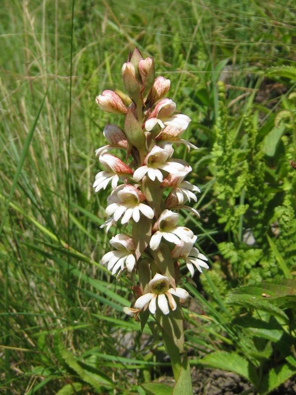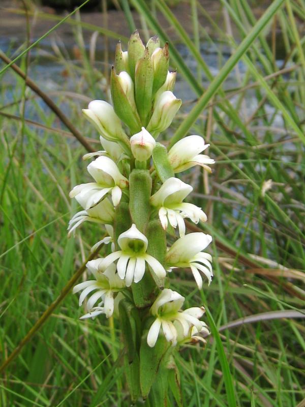 Found in Mozambique, Cape Province and Natal, South Africa near the coast at elevations of sea level to 2000 meters as a small to medium sized, cool to cold growing terrestrial with 1 to 2 spreading near the ground to partly erect, flat to v-shaped in cross-section leaves that blooms in the spring through early fall on an erect, 3 to 27 flowered, densely amassed at the apex inflorescence carrying fragrant flowers.