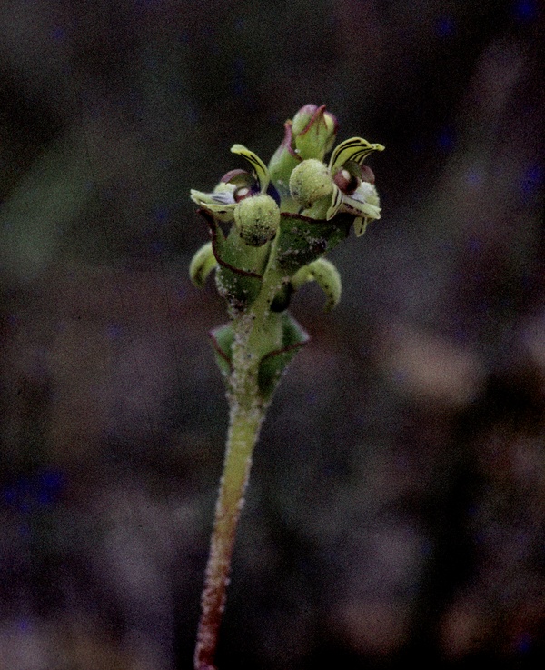 Found in southwestern Cape Province South Africa lowland flats and montane slopes and plateaus in sandy situations at elevations of 100 to 1100 meters as a mini-miiniature to miniature sized, cold growing terrestrial with slender, erect stem carrying 1 to 2, basal, spreading, broadly ovate leaves that blooms in the late winter and early spring on a terminal, erect, short, 1 to 10 flowered inflorescence with broadly rhomboid to ovate, cupped, 1 to 2 times the length of the ovary floral bracts and carry flowers with a faint sweet fragrance. .