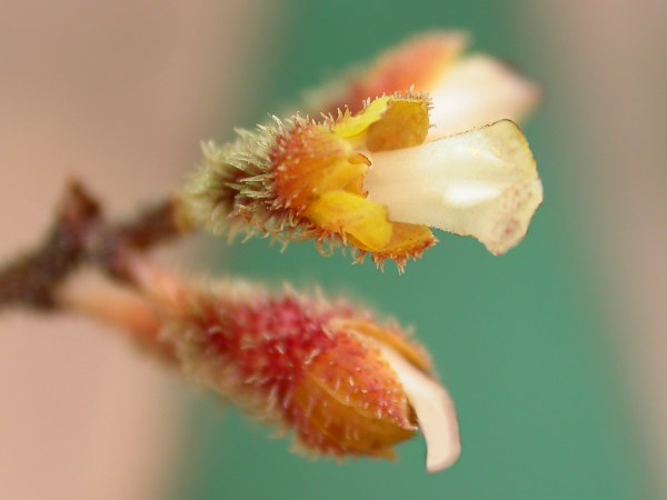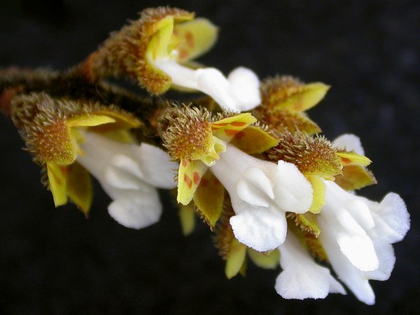 Found in Espirito Santo and Rio de Janiero states of Brasil in wet cool montane forests as a miniature to small sized, cool to cold growing epiphyte with a stem completely enveloped by tight, imbricating sheaths and carrying a single, narrowly oval to lanceolate, obtuse, narrowed below into the conduplicate, elongate, petiole-like base leaf that blooms in the fall on a basal, pendant, 3" [7.5 cm] long, several flowered, slightly fractiflex inflorescence arising on a newly matured stem and holding the flowers in an apical cluster and each has a pilose ovary and sepals
