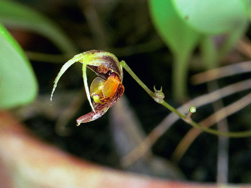 Found in Ecuador as a mini-miniature, caespitose, cool growing epiphyte in cloud forests at elevations of 1000 to 1400 meters with an erect, slender ramicaul enveloped by 2 to 3 tubular sheaths with a single, apical, coriaceous, narrowly elliptical, subactue to obtuse leaf that is cuneate below to the slender petiole that blooms in the spring on an erect, 2.8" [7cm] long, loosely succeessively flowered, racemose inflorescence with thin tubular floral bracts, holding the flowers just above the leaves.