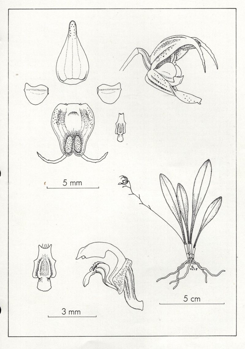 This species is distinguished from others by it's small plant habit, little flowers with a tailless middle sepal, little oval, hairy cushions within the underside of the lateral sepals which do not fill the entire space, leaving a distinct open margin all around and petals with transverse obtuse apices.
