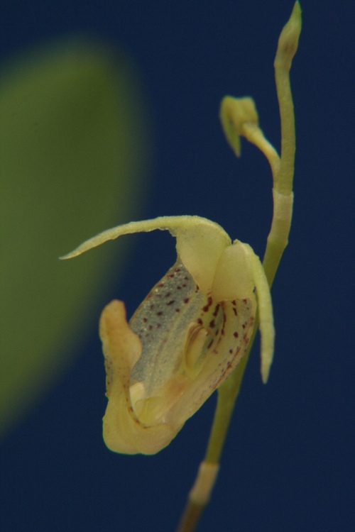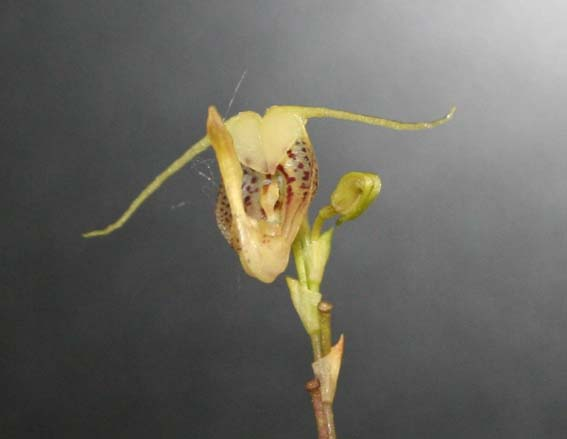 Found in Ecuador without collection data as a mini-miniature sized, cool growing epiphyte with slender, erect ramicauls enveloped by 2 to 3 tubular sheaths and carrying a single, apical, erect, coriaceous, elliptical, acute, gradually narrowing below into the slender petiolate base leaf that blooms in the spring on a slender, suberect, distichous, to 2.4" [6 cm] long, successively many flowered, racemose inflorescence with acute floral bracts