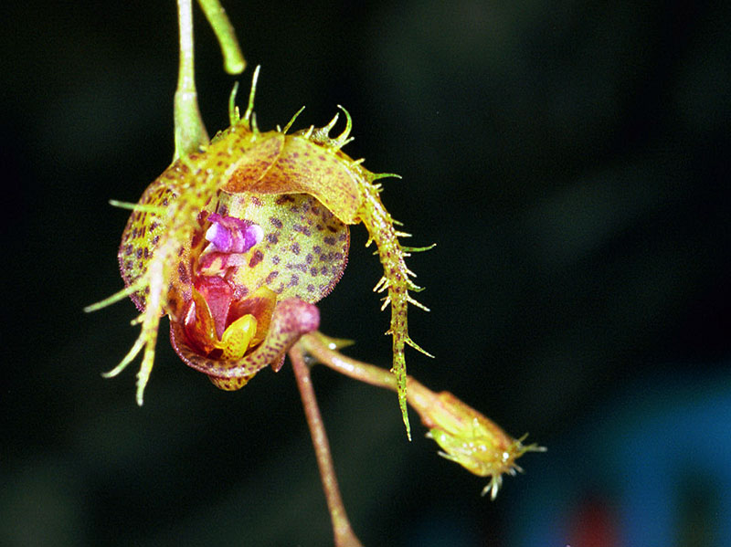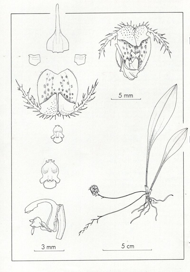 Found in northern Ecuador at elevations of 750 to 1200 meters as a miniature to small sized, hot to warm growing epiphyte with erect to suberect, slender, ramicauls enveloped by 2 to 3 loose, tubular sheaths with a single, apical, erect, thinly coriaceous, elliptical, acute leaf that is cuneate below to the slender petiole that blooms on a erect to descending, loose, successively several flowered racemose, 2 1/2" long inflorescence arising from low on the ramicaul and with successively opening flowers that can occur at any time of the year.