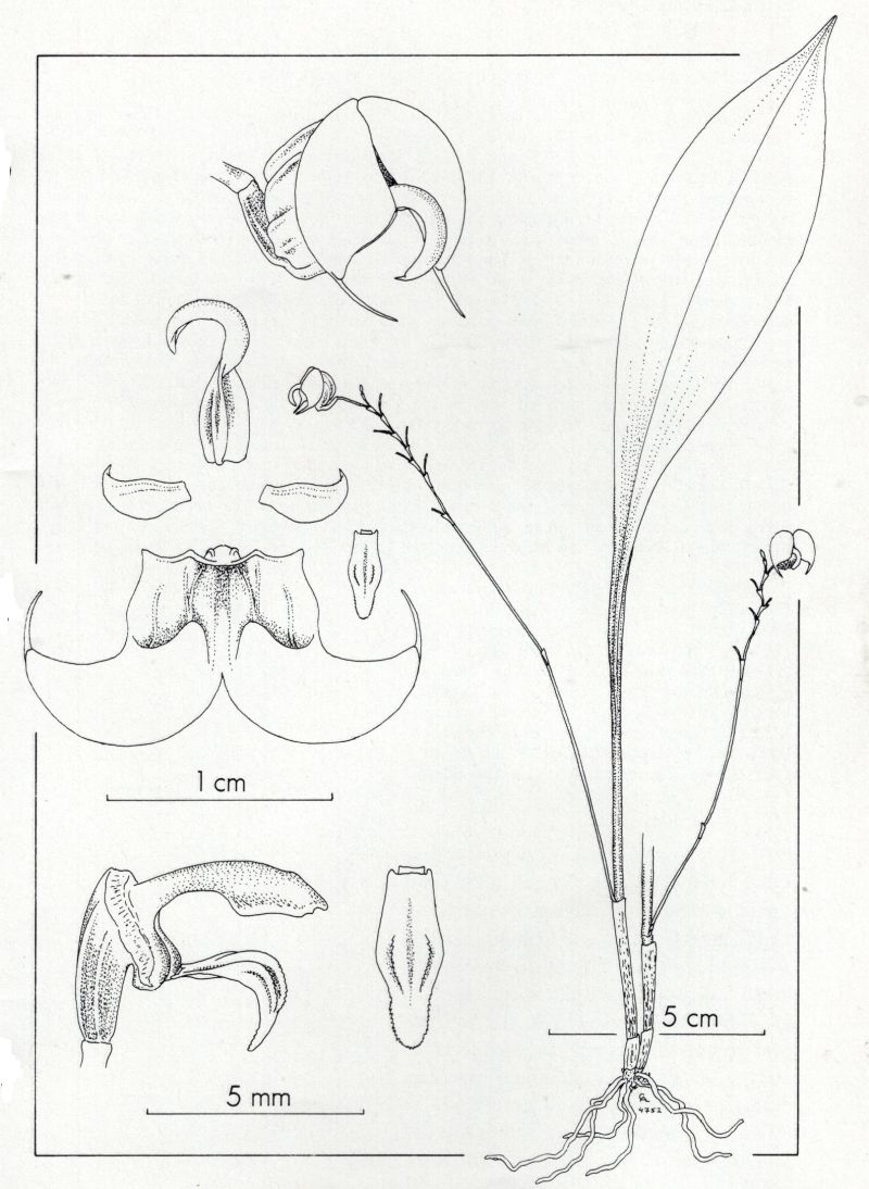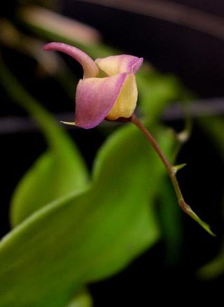 Found in Ecuador at elevations of 1500 to 2200 meters in wet cloud forests as a small sized, cool to cold growing epiphyte with erect, slender ramicauls enveloped basally by 2 to 3 tubular sheaths carrying a single apical, erect, thinly coriaceous, acute, long petiolate leaf that is cuneate below into the slender, channeled petiole and blooms in the spring to summer on a sublax, ascending to horizontal, successively single flowered, 8" [20 cm] long, slender, smooth inflorescence ariaing from low on the ramicaul and carrying thin tubular floral bracts.