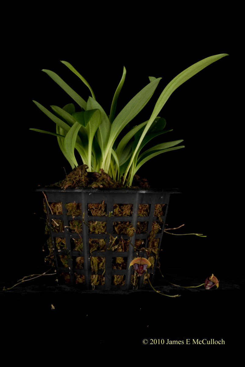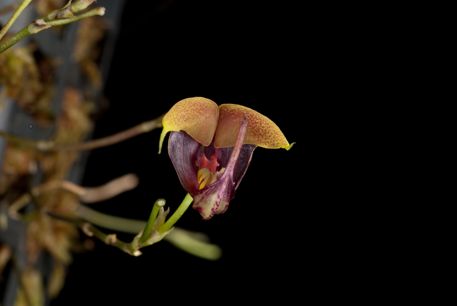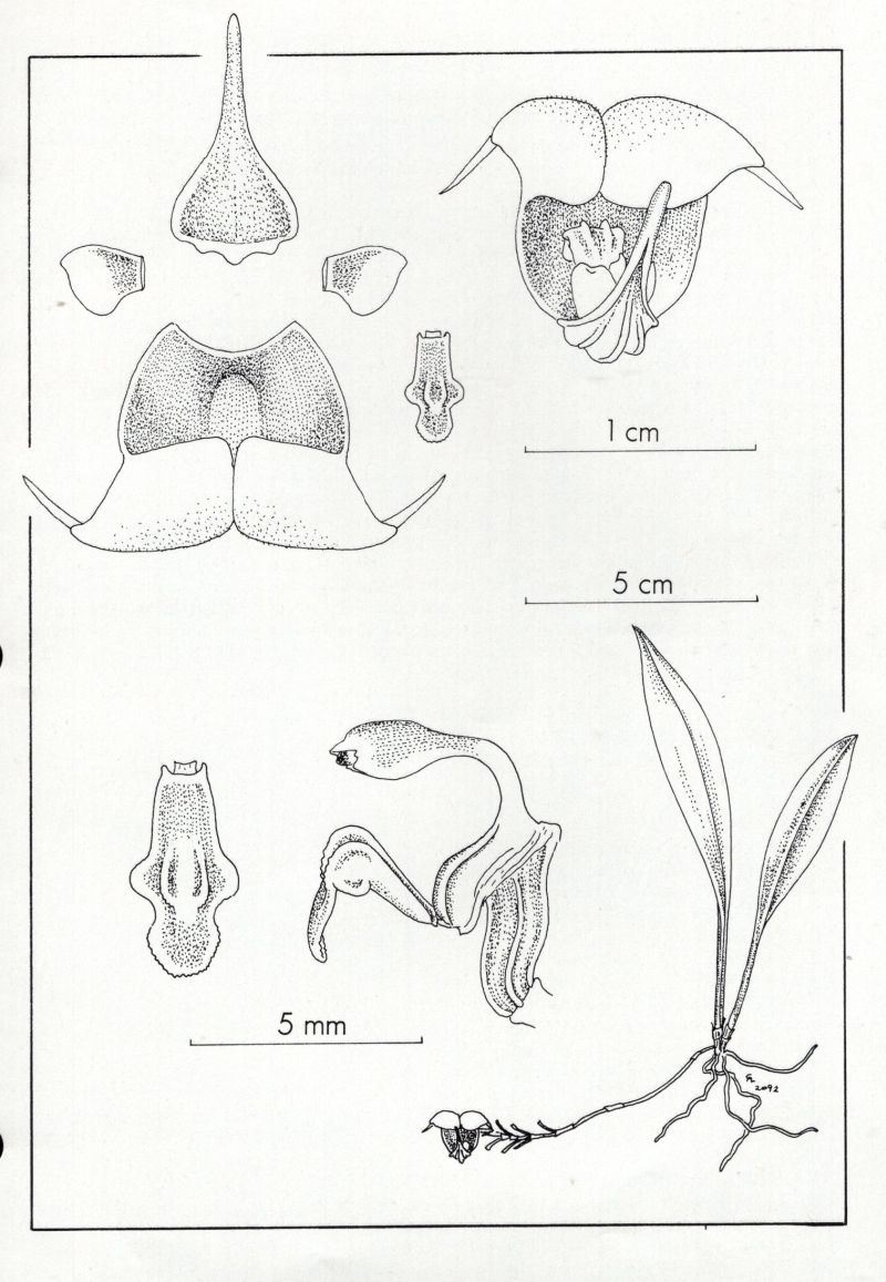 Found in Choco' department of Colombia at lower elevations as a mini-miniature sized, hot to warm growing epiphyte with erect to suberect, slender ramicauls enveloped by 2 to 3, tubular sheaths and carrying a single, apical, erect, thinly coriaceous, narrowly elliptical, acute, gradually narrowing below into the channeled, petiolate base leaf that blooms on a congested, slendre, smooth, horizontal to descending, 5.2" [13 cm] long, successively several flowered, racmose inflorescence arising from low on the ramicaul with thin floral bracts