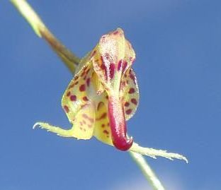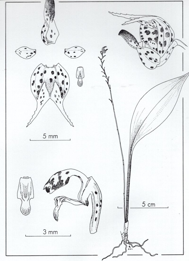 Found in Colombia and Ecuador at elevations of 1450 to 2500 meters as a miniature sized, cool to cold growing epiphyte with erect to suberect, very slender ramicaul enveloped by 2 to 3 tubular sheaths carrying a single, apical, erect, thinly coriaceous, elliptical, acute, acuminate leaf that is cuneate below into the slender petiole and blooms in the summer on a subdense, sharply flexuous slender, smooth, erect to lateral, 4.8" [12 cm] long, successively many flowered, racemose inflorescence.