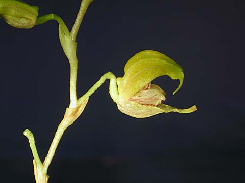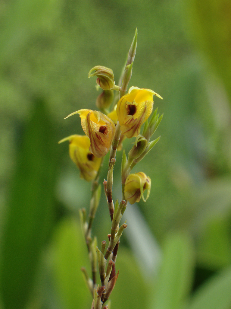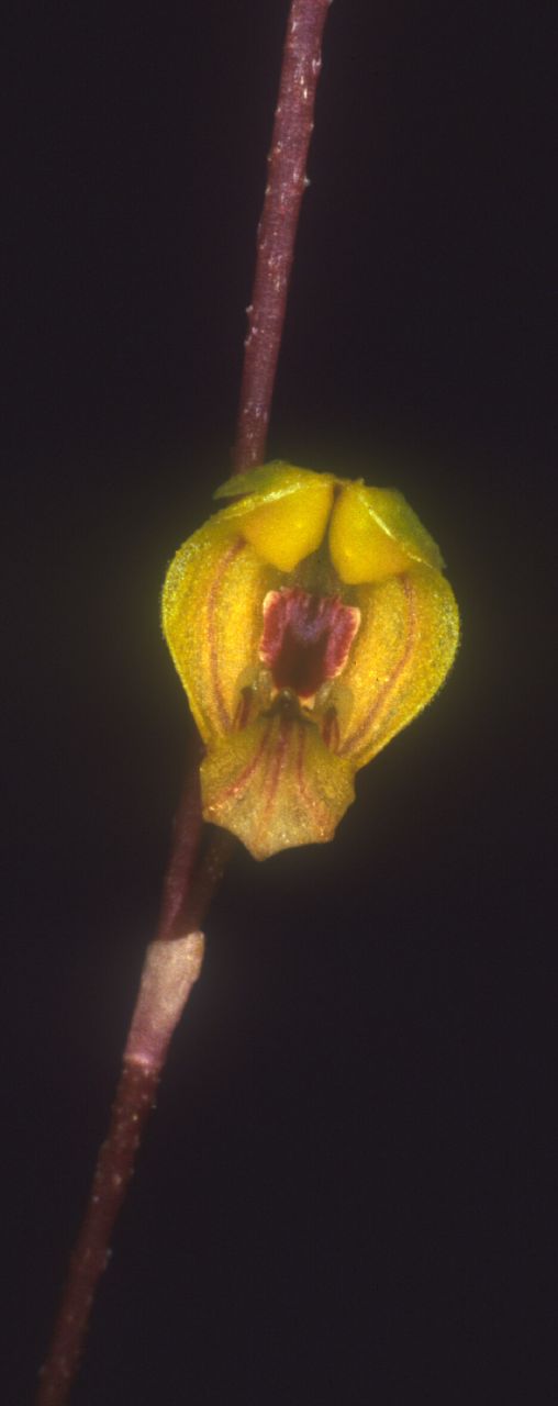 Found in Colombia, Ecuador, Bolivia, Venezuela and Guyana at altitudes of 1300 to 3500 meters as a mini-miniature sized, cool to cold, creeping epiphytic, terrestrial or lithiphytic herb in scrubby vegetation in full sun or shade from with erect, stout ramicauls enveloped by 2 to 3 tubular sheaths carrying a single, apical, erect, thickly coriaceous, elliptic to obovate, sometimes suffused with purple, subacute to obtuse or rounded leaf thqat gradually narrows below into the stout, channeled petiole that blooms at any time of the year on a lateral, erect, racemose, fractiflex, warty, 6" [15 cm] long, few flowered inflorescence which is much longer than the leaves, has oblique floral bracts, with the flowers opening in succession.