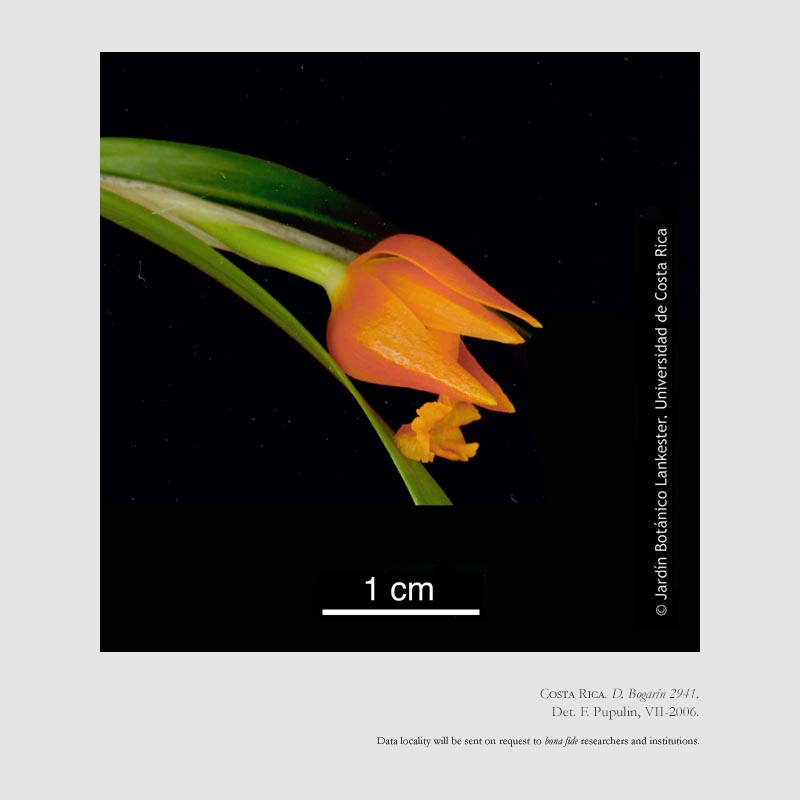Found in Costa Rica and Panama at elevations of 1700 to 2200 meters as a small to medium sized, warm to cool growing epiphyte with superimposed, branching stems carrying 2, apical, subopposite, coriaceous, oblong linear to oblong, rounded and bilobed apically, basally sessile leaves that blooms in the late spring and early summer on a terminal, single flowered inflorescence arising from the apex of the stem and a few imbricating sheaths