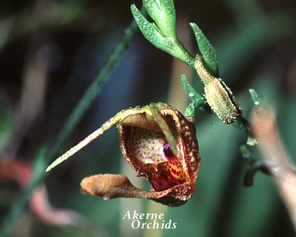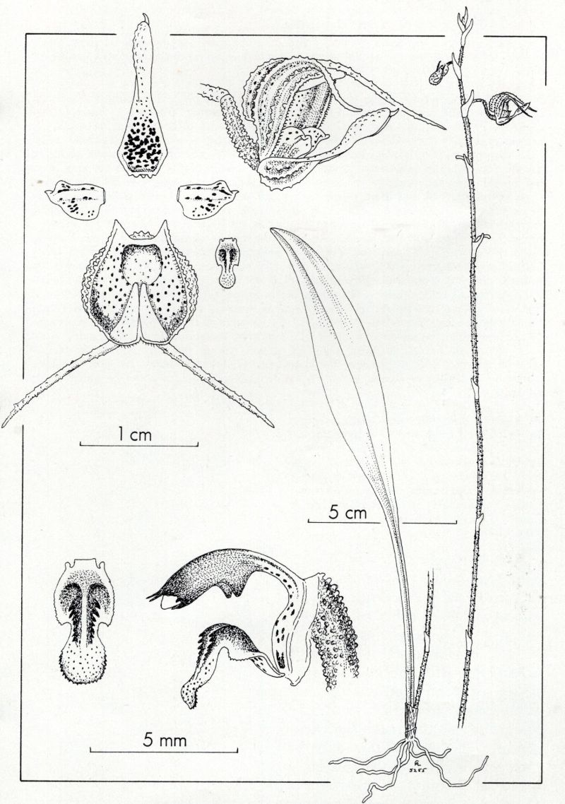 Found in Colombia and Ecuador at elevations of 1700 to 2000 meters as a miniature sized, cool growing epiphyte with stout, erect ramicauls enveloped basally by 2 to 3 tubular sheaths and carrying a single, erect, coriaceous, narowly elliptic, acute, gradually narrowing below into the slender, channeled petiolate base leaf that blooms in the spring on an erect, stout, disitichous, lax, coarsly verrucose, sparsely bracted, several successively flowered, 13.2" [to 33 cm] long inflorescence arising from low on the ramicaul with conduplicate, oblique, elongate, acute, verrucose floral bracts with one to 2 simultaneous flowers
