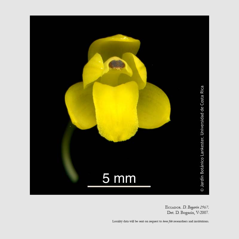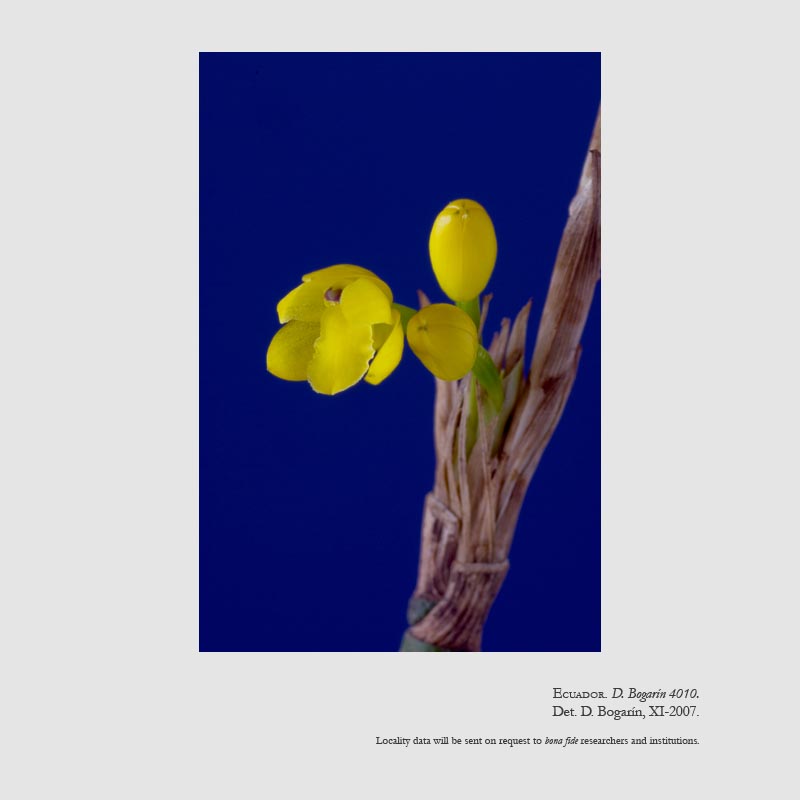 Found From Venezuela, Colombia and Ecuador at elevations of 1200 to 1800 meters as a miniature sized, cool to cold growing epiphyte with erect to pendant, in all directions, dark green brown, swollen, grooved with age, terete stems enveloped by grey, imbricate, tubular sheaths and carrying 2, linear, basally clasping, bilobed apically leaves that blooms in the spring on a fascile of single flowered inflorescence with the flower held close to the leaf base.