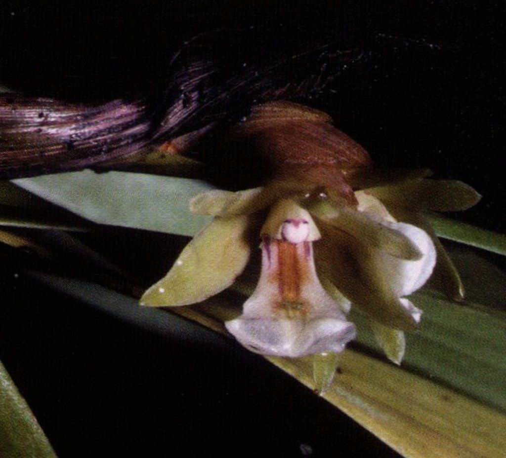 Found in Colombia and northwestern Ecuador in low tropical primary forests at elevations of sea level to 250 meters as a medium to large sized, hot growing epiphyte with an erect to arcuate, cane like, composed of several superposed, slightly swllen, sulcate stems carrying a single to occasionally 2, apical, linear-oblong, obtuse apically, basally clasping leaves that blooms in the fall and winter on a short, .4" [1 cm] long, terminal, successively 1 to 2, few flowered inflorescence arising from the scarious, imbricating sheaths and carrying white flowers with a flush of yellow on the inner portion of the lip.