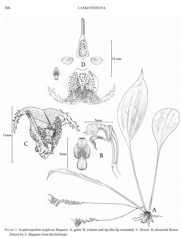 "Scaphosepalum zieglerae is recognized among the species of Scaphosepalum by a unique combination of characters: the large, long petiolate, dark-green leaves, the caudate leaf apex and, specially, the flowers with spiky tails and dark blood-red colored lip. Scaphosepalum zieglerae looks superficially similar to S. beluosum, mainly because of the long petiolate plants and lateral inflorescences. In addition, it seems that S. zieglerae and S. ophidion could be related because they share long flexuous racemes with conspicuous acuminate bracts, fimbriate tails of the synsepal and the oblong-subpandurate lip. Scaphosepalum zieglerae shares with S. fimbriatum Luer & Hirtz the fimbriated sepaline tails, but it differs from the latter species by the size of the plants, the shape and length of the leaves, and the size and general morphology of the flowers" Baquero 2017