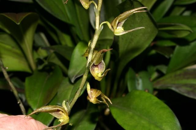 Found in Antioquia departemnt of Colombia at elevations around 1500 meters as a small sized, cool growing epiphyte with erect, stoutramicauls enveloped by 2 to 3 tubular sheaths and carrying a single, apical, erect, coriaceous, elliptical, subacute, gradually narrowing below into the elongate, petiolate base leaf that blooms in the winter and spring on an erect, rigid, stout, distichous, 24" [60 cm] long, many successively flowered, racemose, verrucose inflorescence arising from low on the ramicaul and has 2 t0 3 flowers open at any one time.