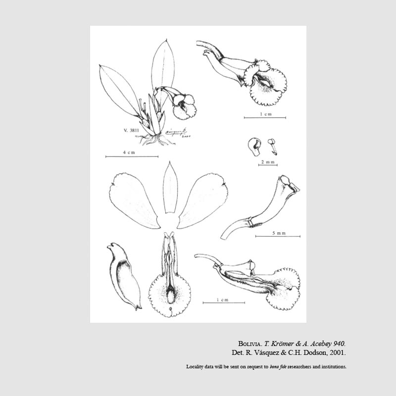 References W3 Tropicos, Kew Monocot list , IPNI ; Revista Soc. Boliv. Bot. 3: 29. 2001 Vasquez & Dodson as Scelochiliodes acebeyae; *Rudolf Schlechter Die Orchideen Band 1C lieferung 44-45 pg 2763 - 2898 Brieger 2001; AOS Bulletin Vol 77 #12 2008 as Comparettia acbeyae;