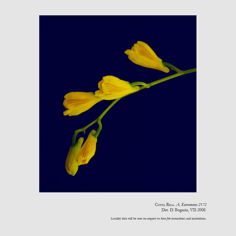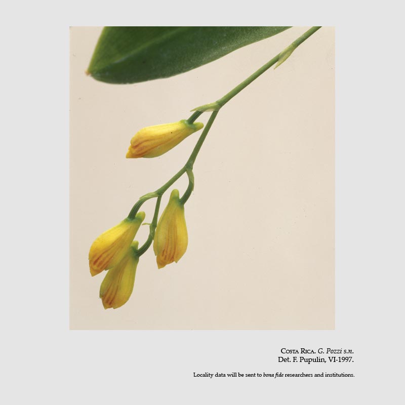 Found in Costa Rica in lower montane forests on small branches in windy locations at eleavtions of 1500 to 2200 meters as a small sized, pendant to arcuate, warm to cool growing epiphyte with subcylindric to fusiform, compressed pseudobulbs enveloped basally by 2 to 3, subulate, non-foliaceous sheaths and carrying a single, apical, coriaceous to fleshy, elliptic-lanceolate to oblanceolate, carinate beneath and narrowing below into the petiolate base leaf that blooms in the late summer and fall on a lateral, arcuate to pendant, racemose to paniculate, 5 to 6" [12.5 to 15 cm] long, several flowered inflorescence with each branch carrying 4 to 6 successively opening, campanulate flowers that do not open well.