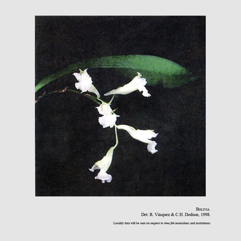 Found in Santa Cruz Bolivia in wet montane forests at elevations of 1200 to 1400 meters as a mini-miniature sized, warm to cool growing epiphyte with subcylindrical, sulcate pseudobulbs enveloped basally by 2 sheaths and carrying a single, coriaceous, rigid, fleshy, linear, acute, gradually narropwing below into the conduplicate petiolate base leaf that blooms in the fall on a basal, suberect to curved, racemose to paniculate, 3.2 to 7.2" [8 to 18 cm] long, few flowered inflorescence.