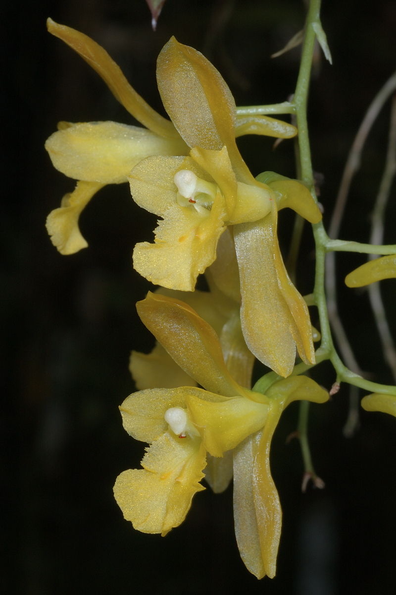 Found in Ecuador in wet montane, cloud forests on the western slopes of the Andes at elevations of 950 to 2000 meters as a small sized, cool and pendant growing epiphyte with oblong cylindric [mature plants] psuedobulbs enveloped basally by several, distichous, imbricating, lower leafless and upper leaf-bearing sheaths and carrying a single, apical, obovate, acute, leaf that tapers to a conduplicate base and blooms in the late winter through late spring on a basal, 12" [30 cm] long, few to several flowered inflorescence arising on a mature pseudobulb through the leaf sheaths. Immature plants of this species appear to be equitant fan orchids and can have bloom spikes, yet with age they do develop psuedobulbs.