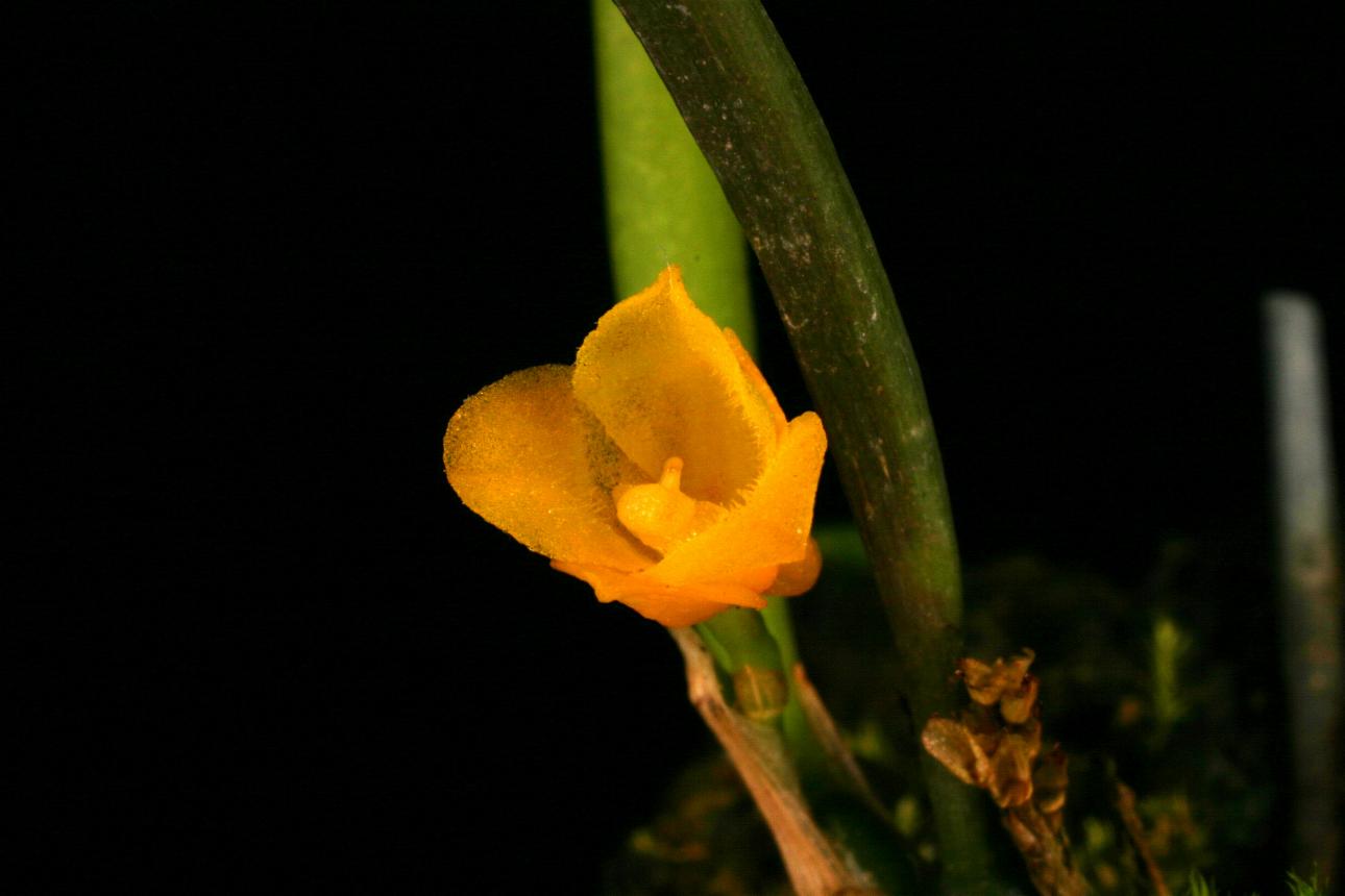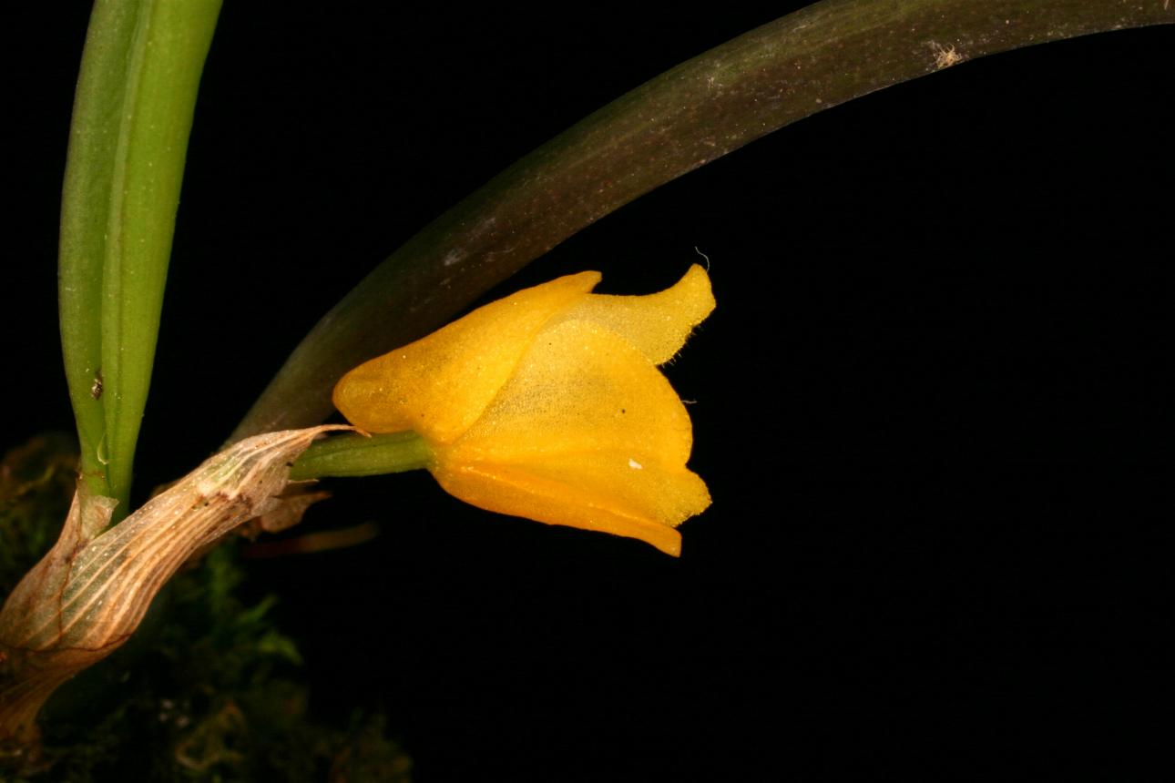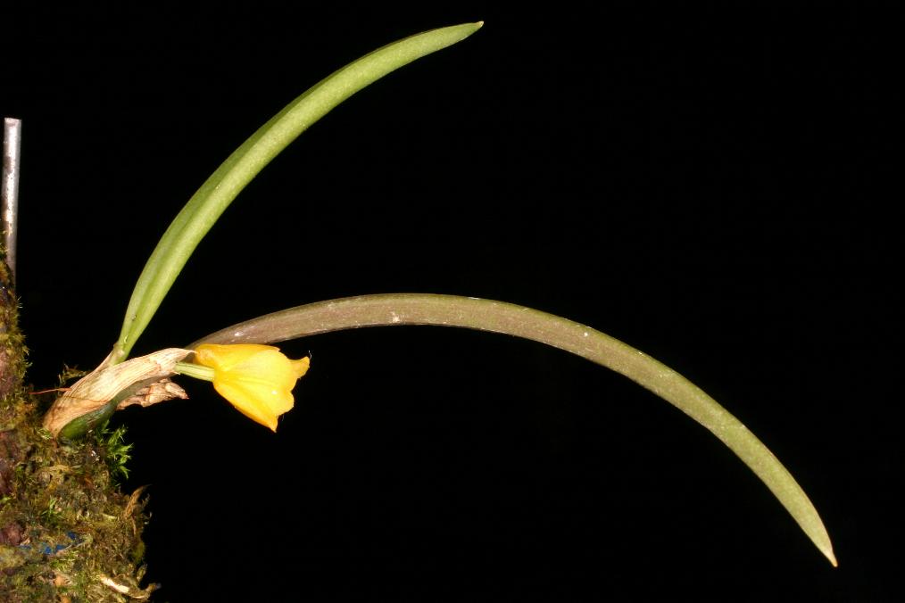 Found in Ecuador in citrus trees in wet forests at elevations around 500 meters as a miniture sized, hot to warm growing epiphyte with small, oval pseudobubls enveloped basally by several, disitichous, imbricating sheaths and carry an apical, single, narrowly linear , fleshy, obtuse, conduplicate leaf that blooms in the fall through spring on an axillary, slender, erect, to .8"[ 2 cm] long, few to several flowered, racemose inflorescence arising through sheath axils of a newly matured pseudobulb and carrying the single, successive flowers all towards the apex.