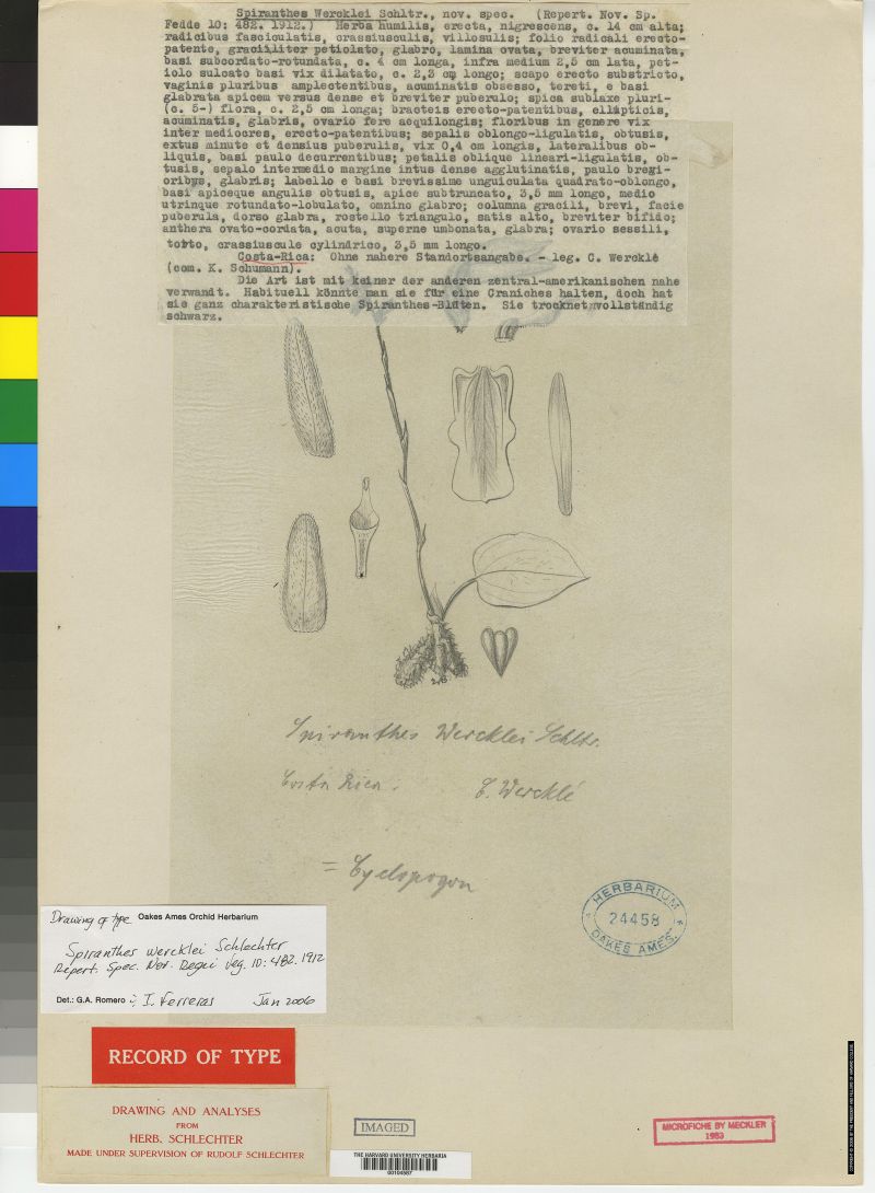 References W3 Tropicos, Kew Monocot list , IPNI ; Repert. Spec. Nov. Regni Veg. 10(263-265): 482. Schlechter1911 as Spiranthes wercklei drawing fide; *Bot. Mus. Leafl. 28(4): 358. Garay 1980[1982] as Schiedeela wercklei; Manual de Plantas de Costa Rica Vol 3 Hammel, Grayum, Herrera and Zamora 2003 as Schieldeela werclei; AOS Bulletin Vol 86 #5 2017 photo fide;