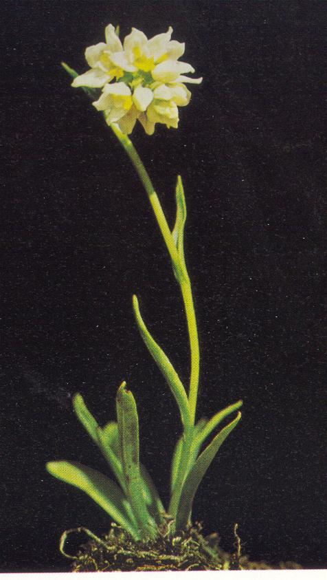 Found in eastern South Africa as a miniature to small sized, cold growing terrestrial species occuring in rocky to marshy grasslands at elevations of 1000 to 3000 meters in areas with higher rainfall with egg-shaped tubers giving rise to two to 10 basal, and about 4 above leaves and blooms in the spring and summer on a 2 to 20" long, erect, terminal, cylindrical-oblong, dense, several flowered inflorescence holding the flowers in a dense ball towards the apex.