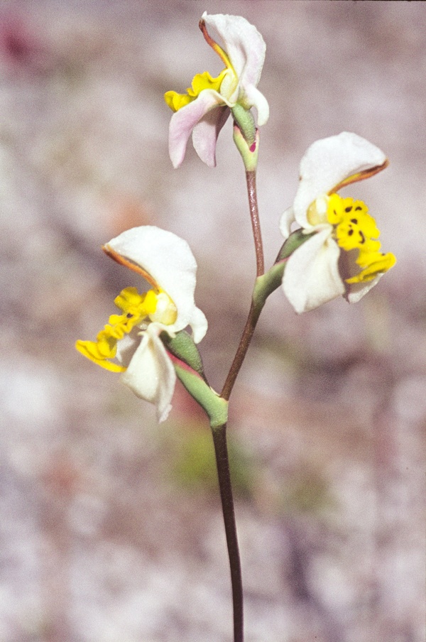 Found in west southwestern Cape Province on sand along streams at elevations of sea level to 1000 meters as a small to medium sized, cold growing terrestrial with cauline, basally claspingleaves that blooms in the spring on an erect, terminal, 6 to 14" [15 to 35 cm] long, 1 to 3 [5] flowered inflorescence