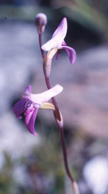 Found only in southwestern and southern Cape Province of South Africa in montane in sandstone and rocky areas at elevations of 900 to 1200 meters as a mini-miniature to medium sized, cold growing terrestrial orchid with cauline, basally clasping leaves that blooms in the spring on an erect, terminal, 3.2 to 14" [8 to 35 cm] long, 1 to 7 flowered inflorescence